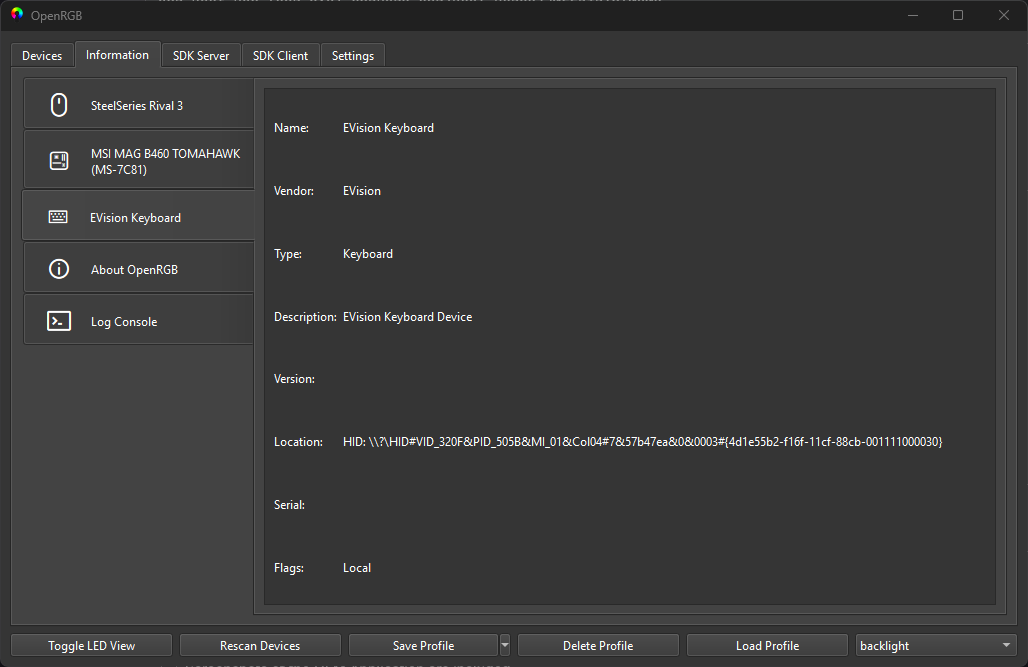 [Debug:] [320F:505B U=0080 P=0x0001 I=1] Evision - RGB Keyboard
