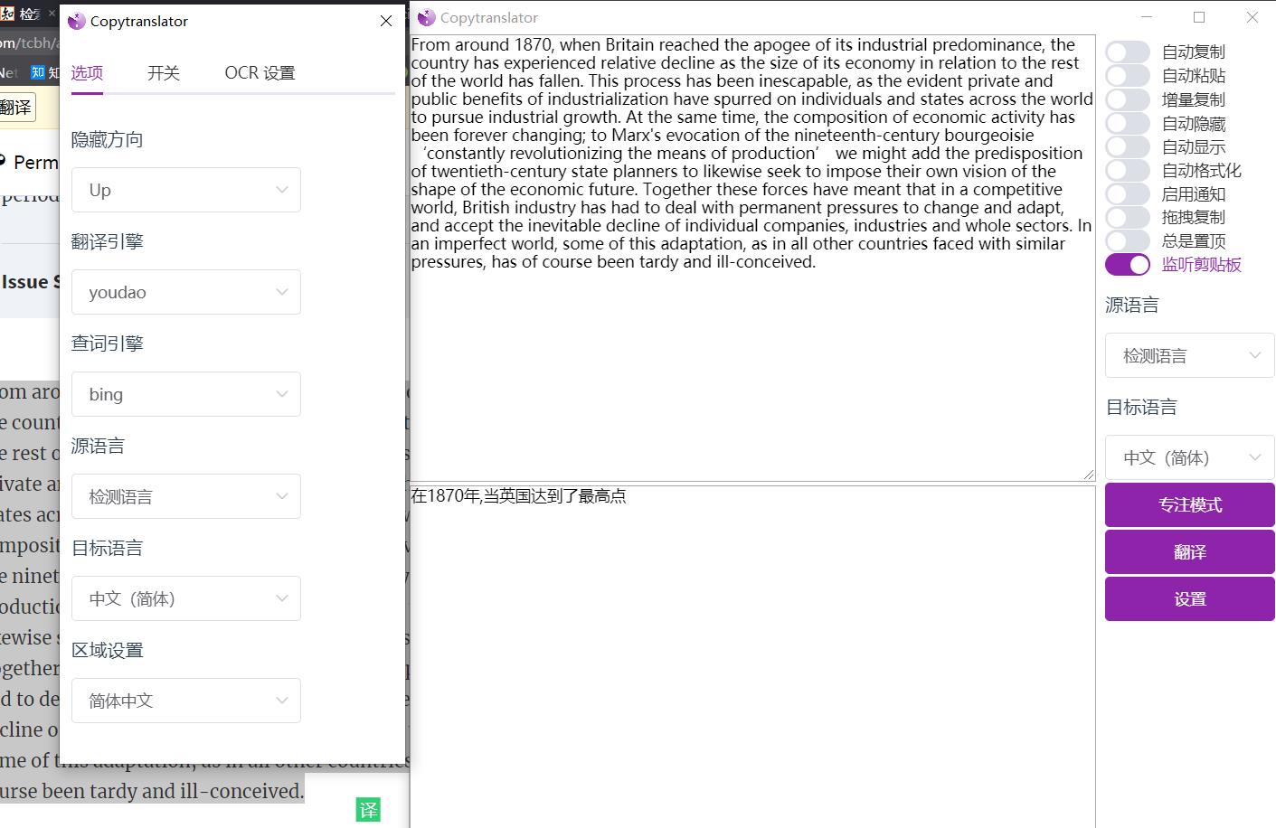 - 只要打开有道引擎,复制进去,监听与否都只能翻译第一句话的前几个字