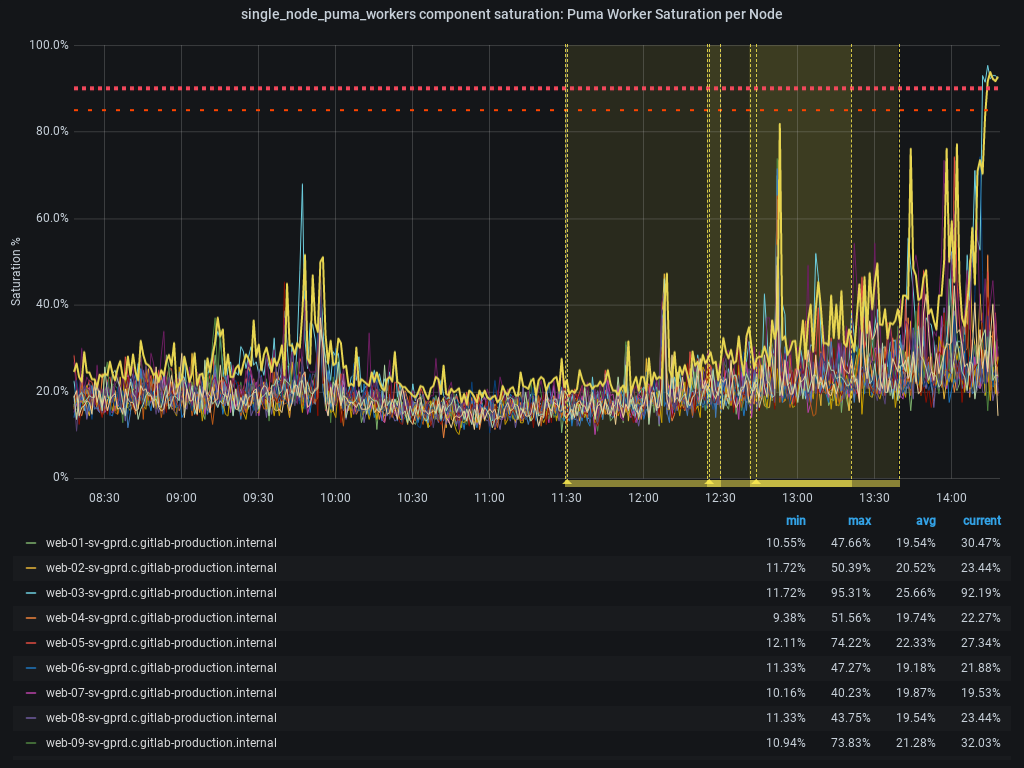 2020-06-24: The Puma Worker Saturation per Node resource of the web service (main stage), component has a saturation exceeding SLO and is close to its capacity limit.