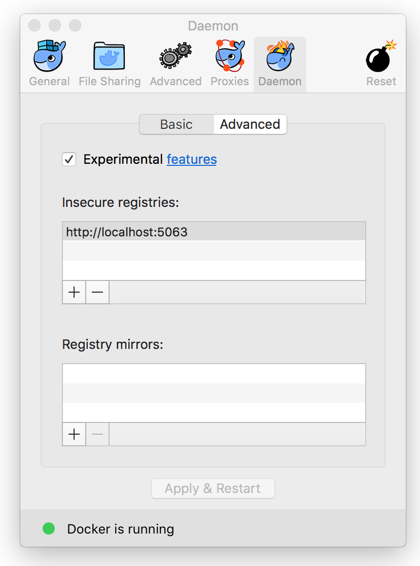 Configure the Docker Daemon to allow pushing to the insecure registry. With Docker for Mac, from the menubar icon -> Preference -> Daemon -> Insecure Registries -> Add http://localhost:5063 -> Click the "Apply & Restart" button