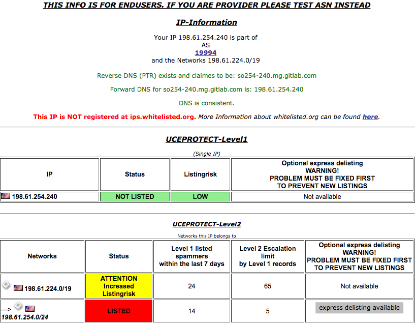 The GitLab.com outgoing mail server 198.61.254.240 is blacklisted at UCEPROTECT Blacklist Policy LEVEL 2