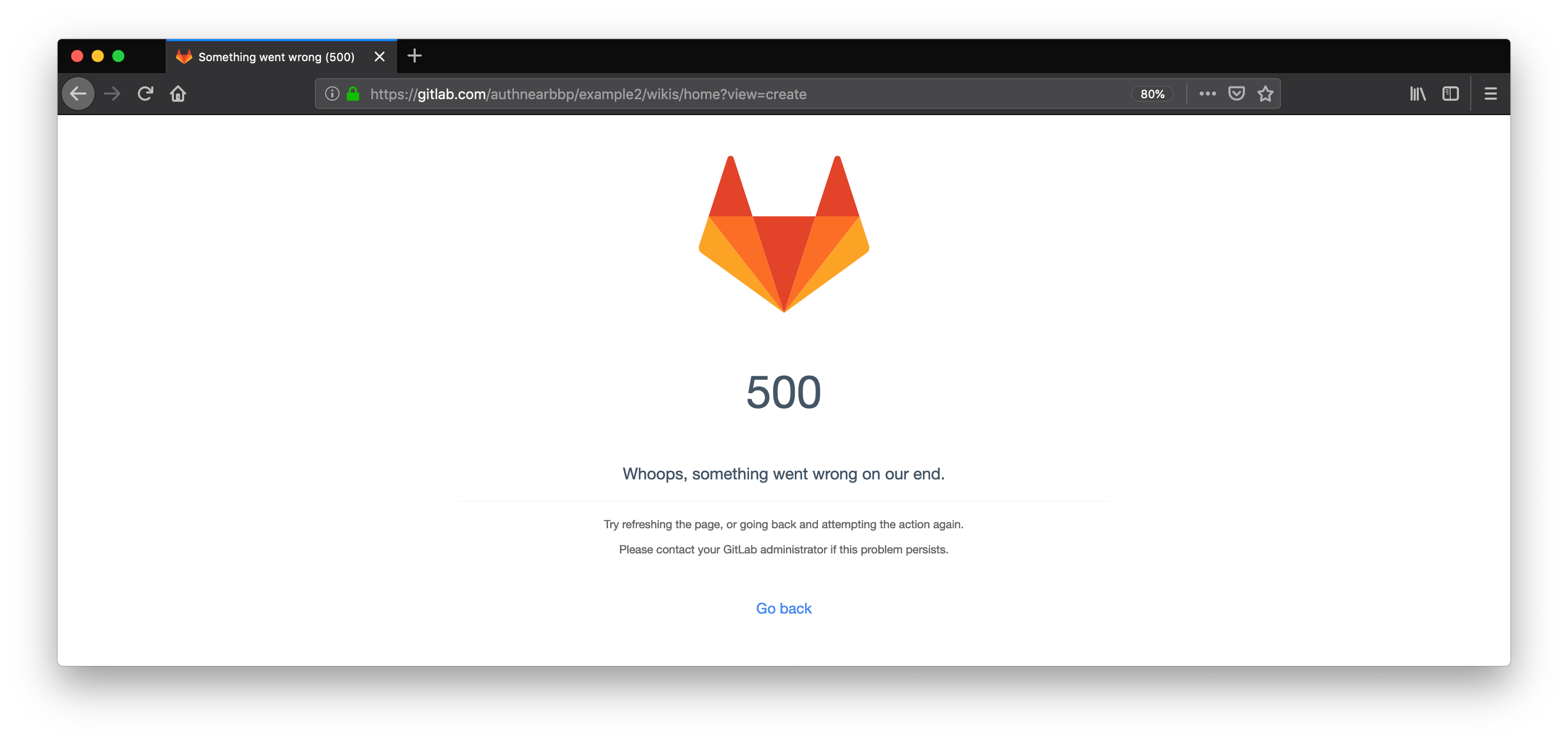 [a](javascript:alert(1))and observe that it becomes completely inaccessible, throwing a 500 error (e.g. https://gitlab.com/authnearbbp/example2/wikis/home)