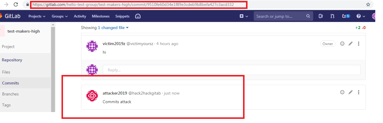 Next attacker will create comments on public project commits which are created by the group.