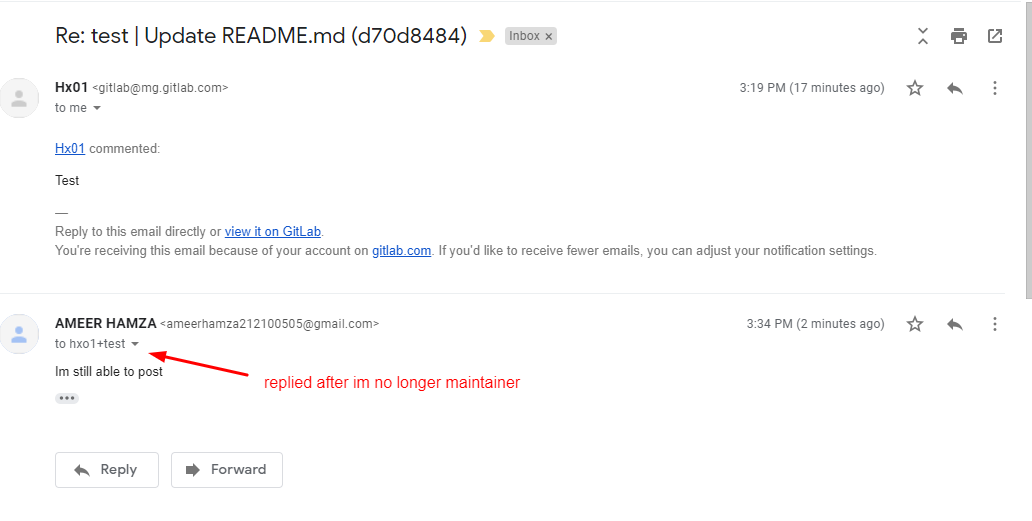 the attacker (previously maintainer) is able to comment in internal commits by replying to the notification email which were received before :