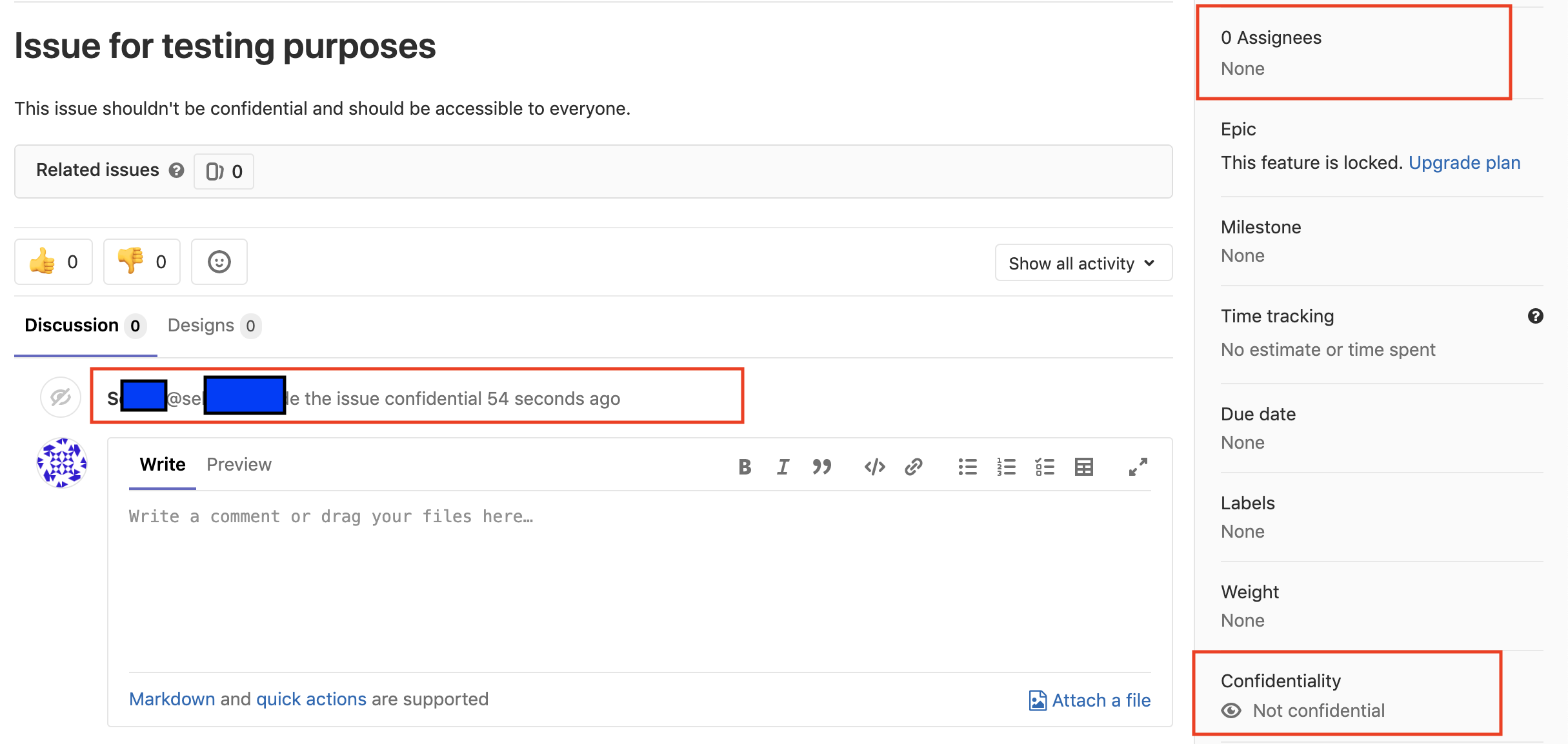 - Not being able to arbitrarily set the confidentiality attribute of an issue for which I've been assigned to, specially if I don't have enough permissions for such action.