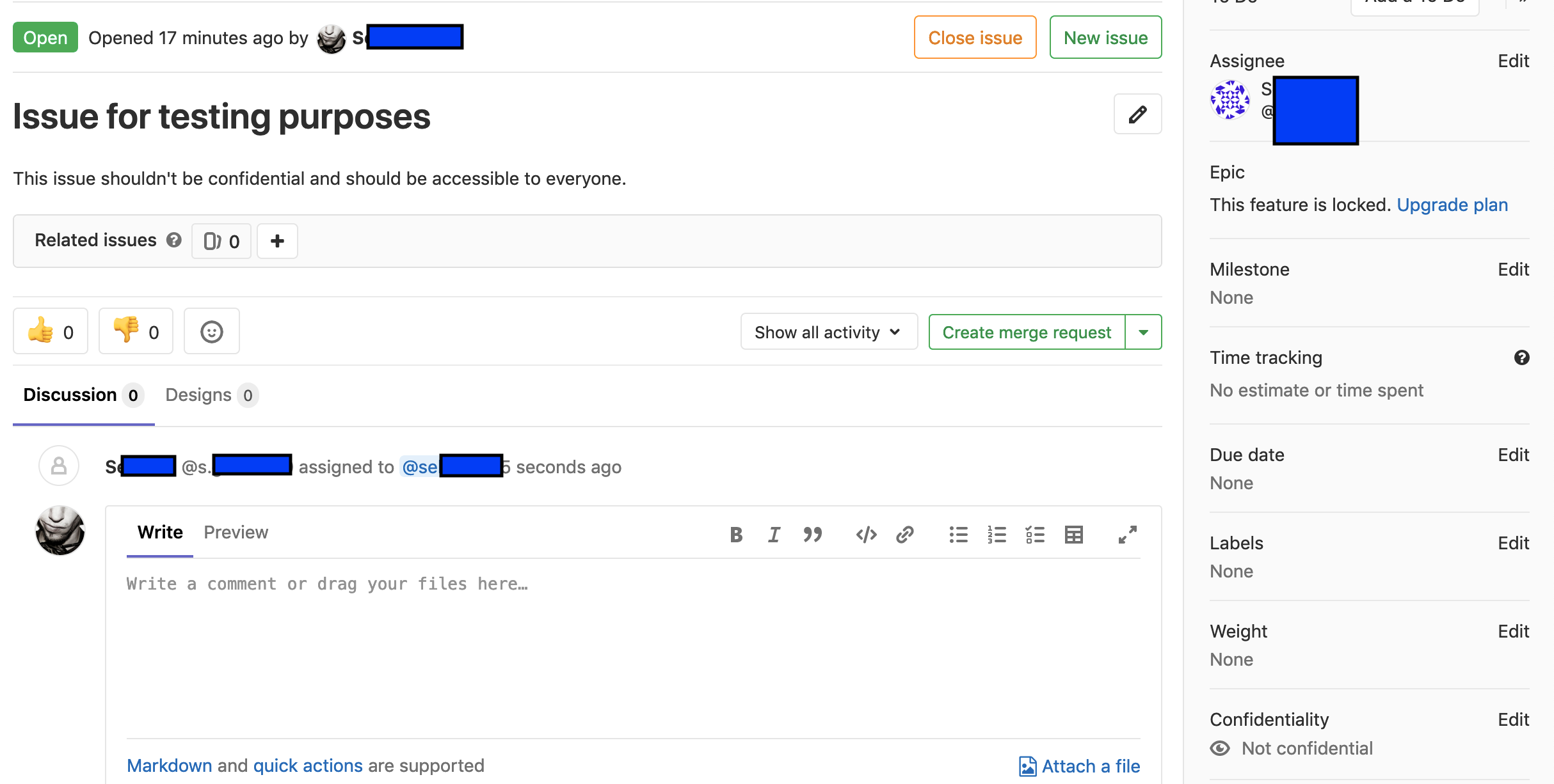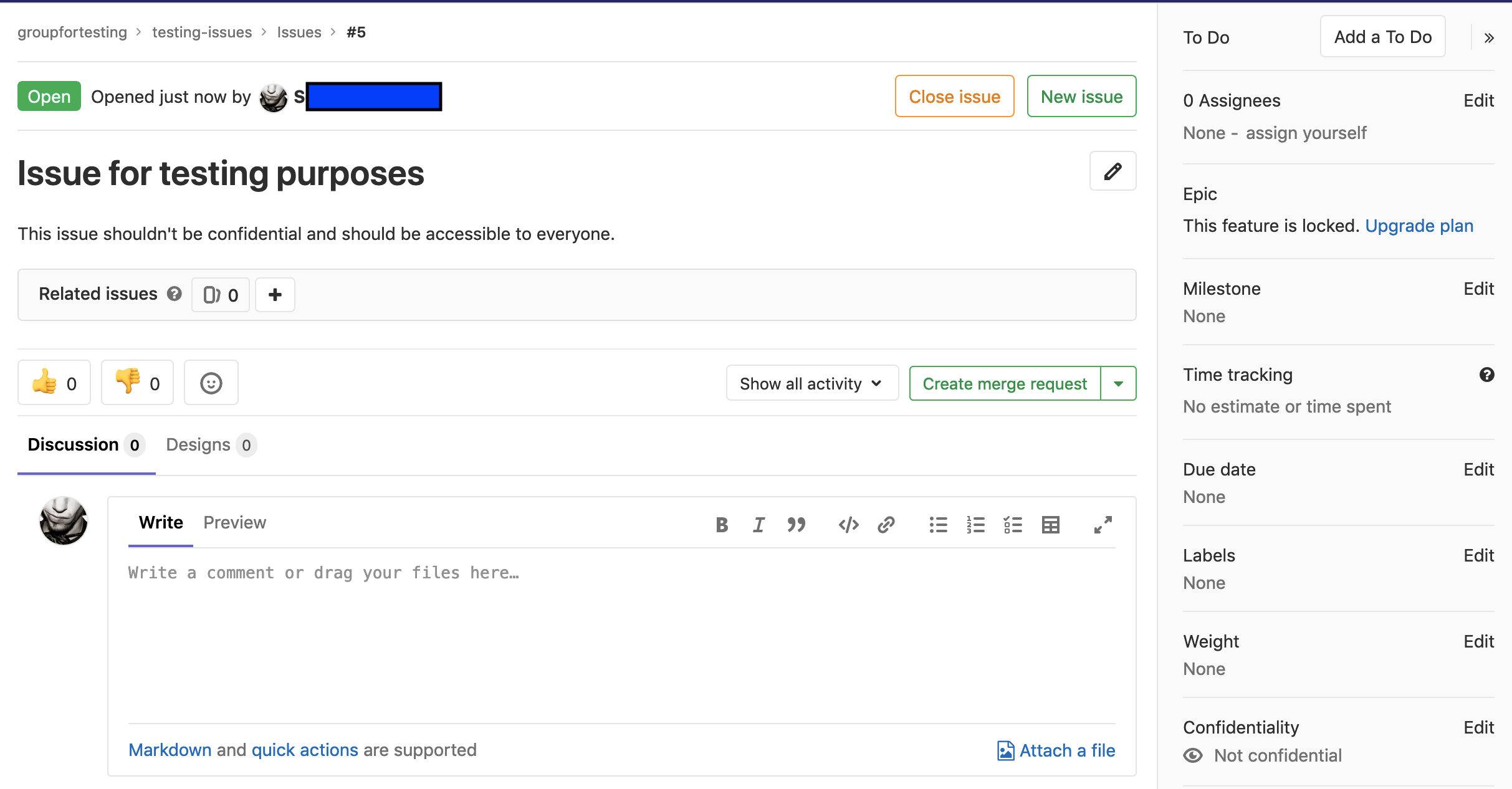 After visiting the new issue as the attacker@gitlab.com we can observe two things: