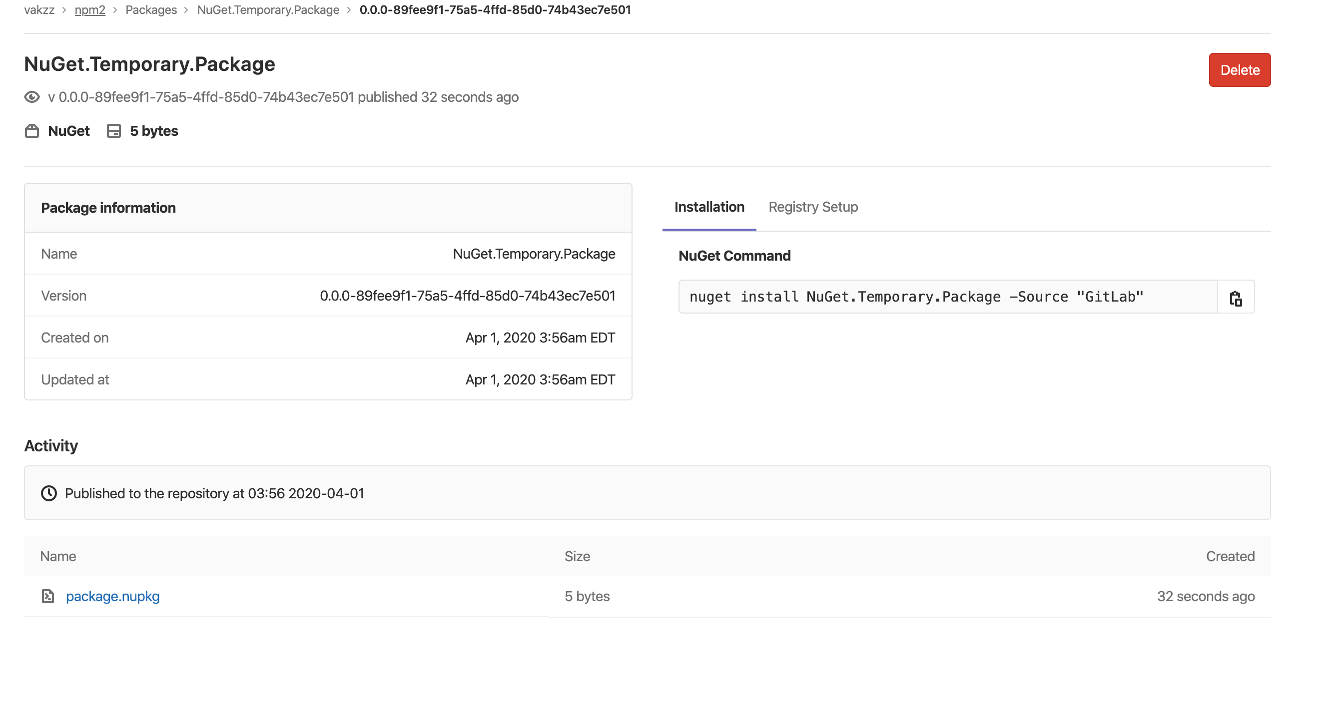 /tmp/gggwas on the server it will now be accessible via the package list, eg http://gitlab-vm.local/vakzz/npm2/-/packages/56