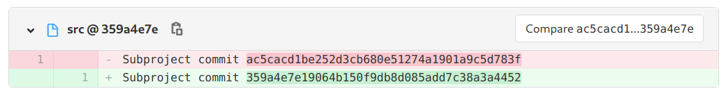 But if the new commit is in a different branch or a rollback, the compare view does not show all changes between the two commits. The diff that is shown in repo/-/compare/oldcommitsha...newcommitsha is the same that would be shown by git diff oldcommitsha...newcommitsha. But from the view of the parent repository, git diff oldcommitsha..newcommitsha would be of more interest.