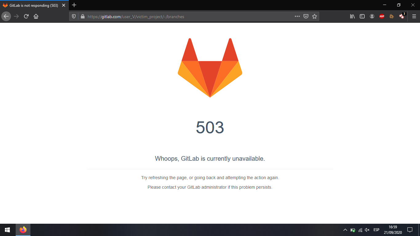 Ahora cualquier persona que visite la pagina principal del proyecto en gitlab.com, se encontrara con la ruta 404 indicando que la pagina no se encuentra, si accede a https://gitlab.com/user/project/-/branches se encontrara con la ruta 503 indicando que gitlab no esta disponible.