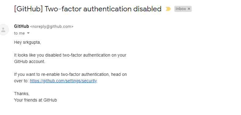 When I tried the same steps on Github, it notifies the users when 2FA was disabled. Please check this screenshot: