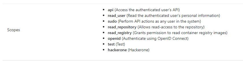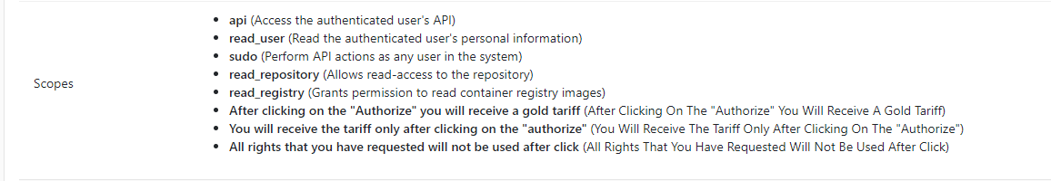 Hello again! Found that in applications (https://gitlab.com/profile/applications) the scope that we pass in the request when creating and editing the application is not checked. It turns out that we can pass your scope, with its text. I decided to try it and I did it!