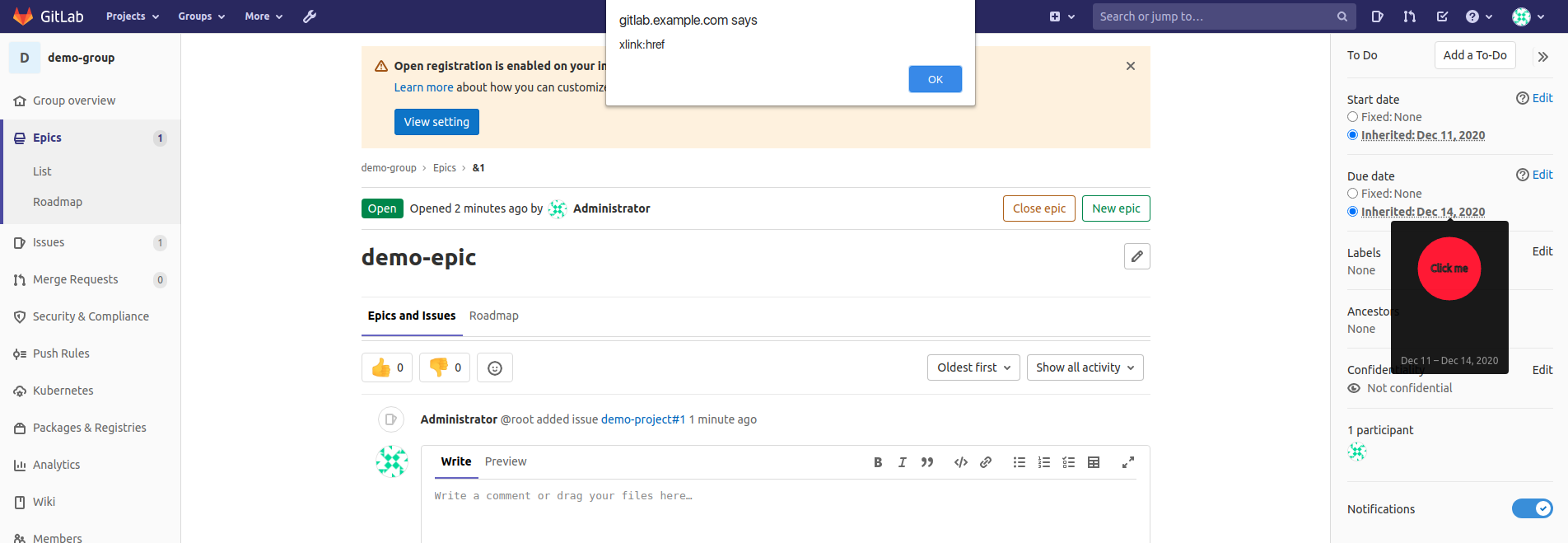 It's possible to inject arbitrary JS code into an epic's page using the Start date and Due date.