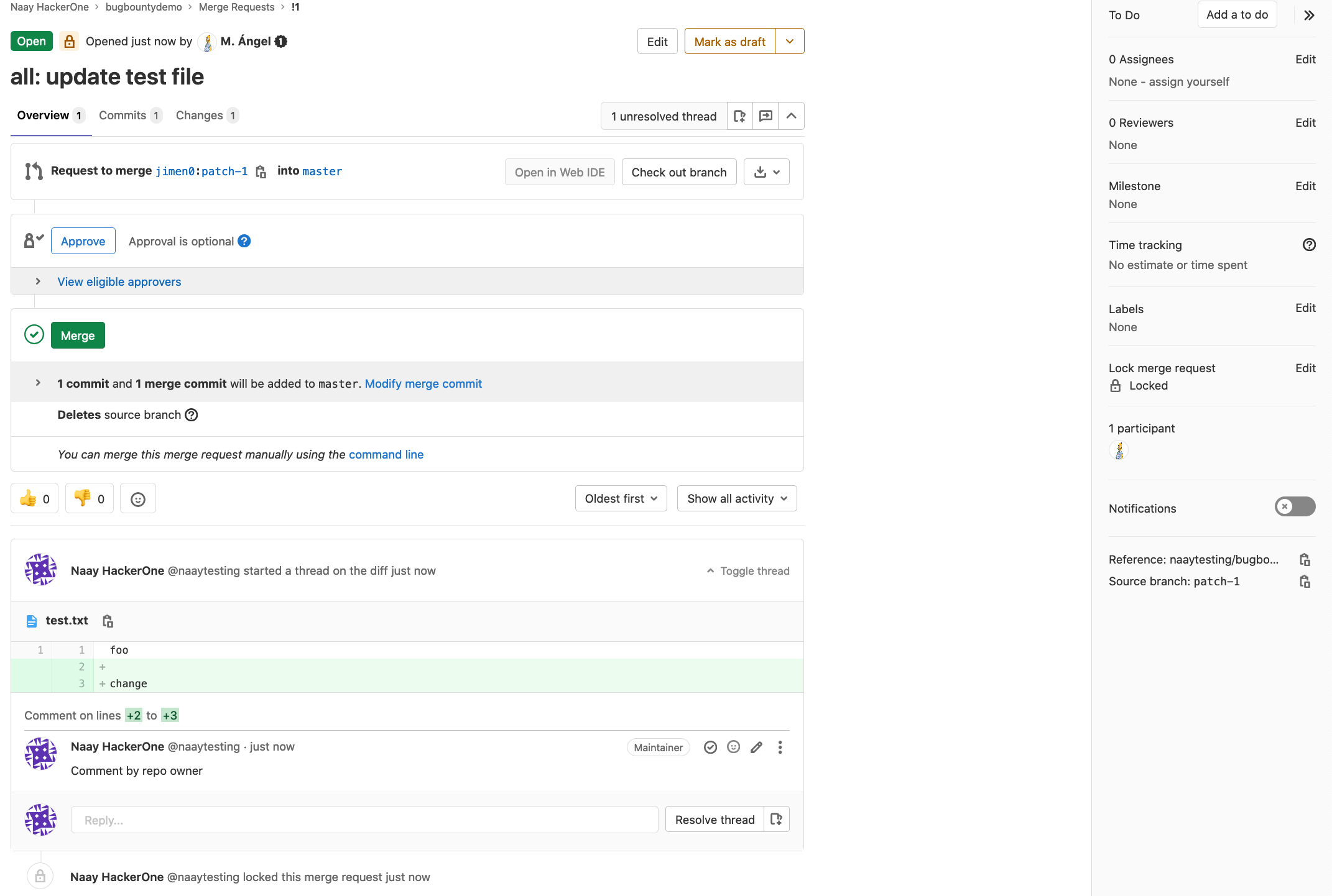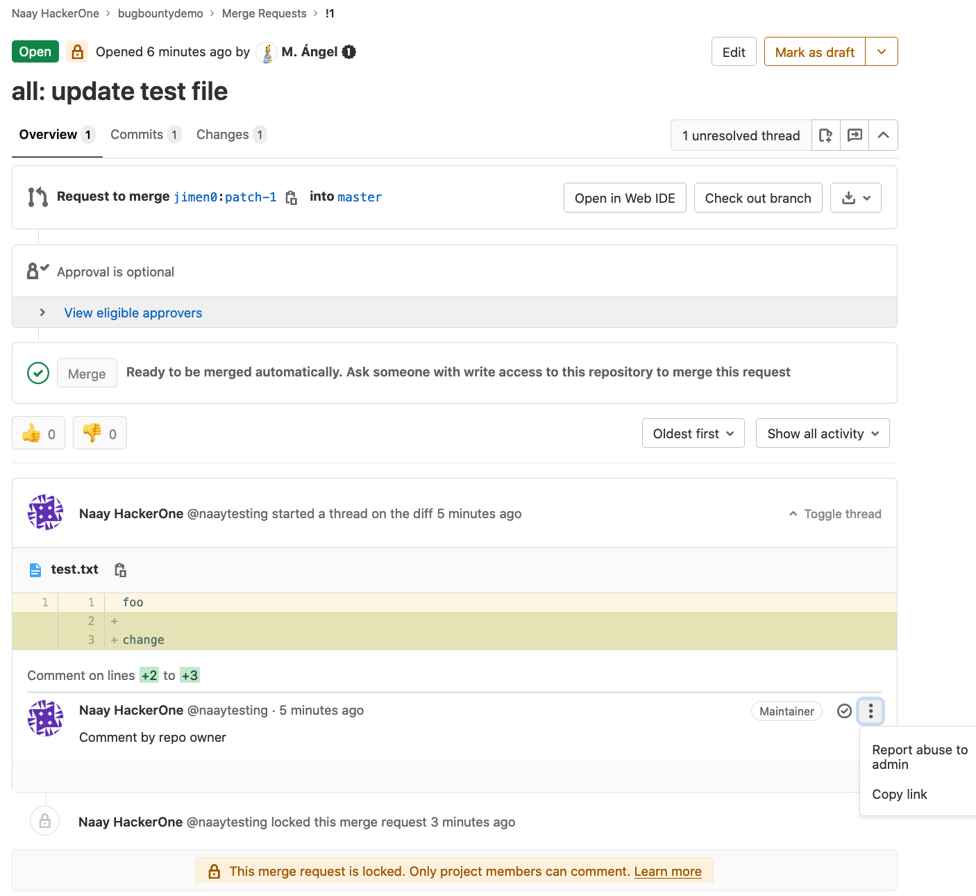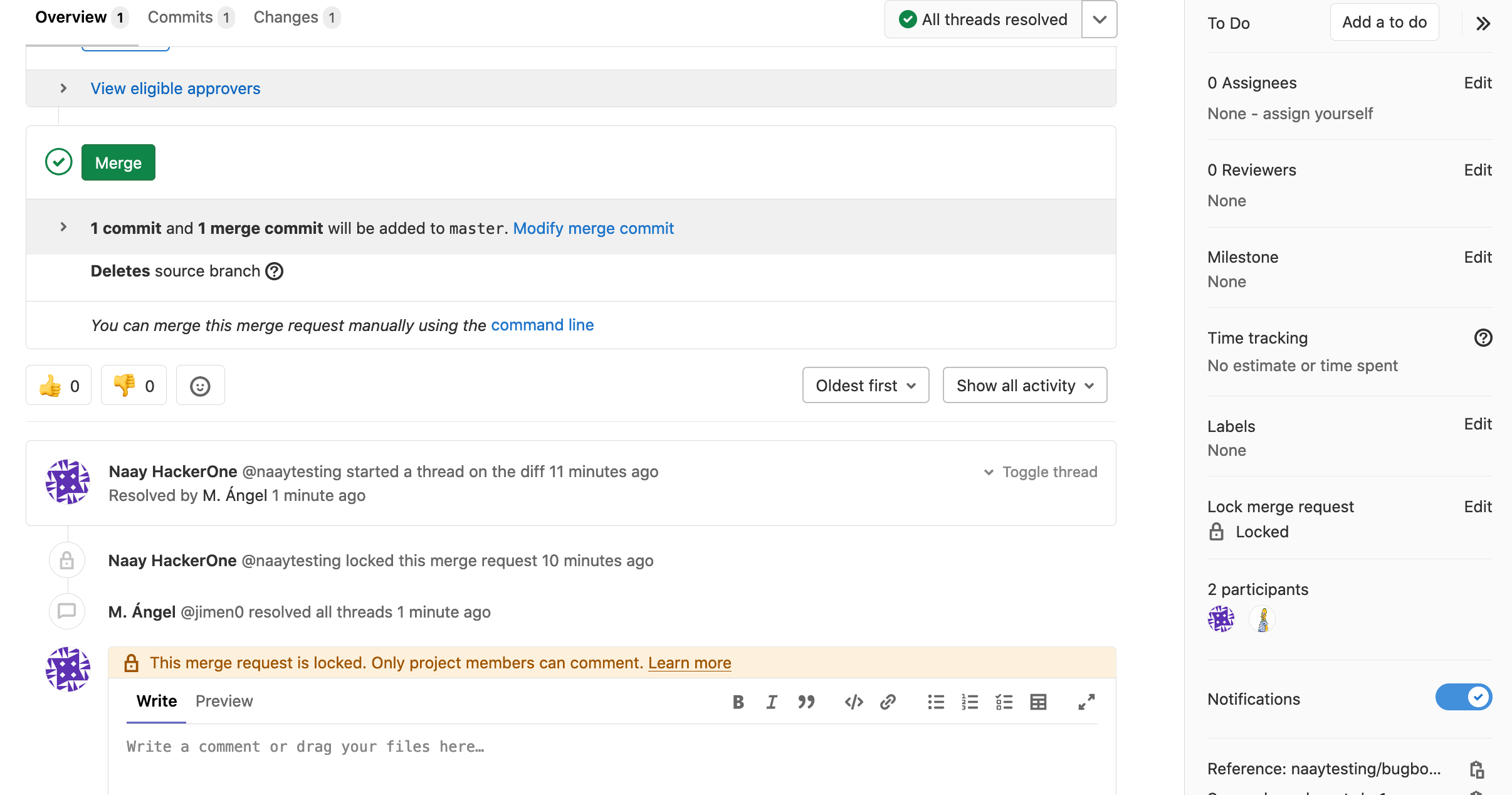 Victim: refresh the MR and notice the attacker was able to perform activities against it and the discussion is resolved now.