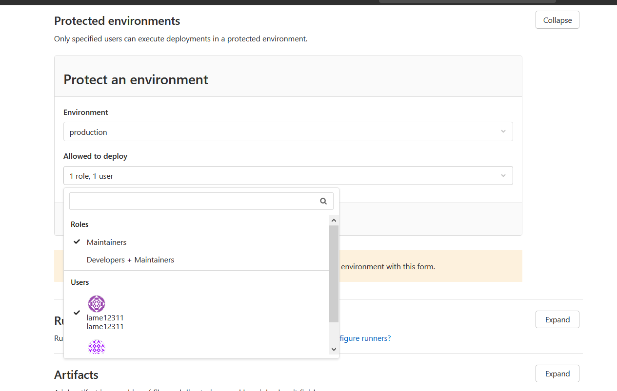 Maintainer or owner can define protected environment and users who can access the protected environment.