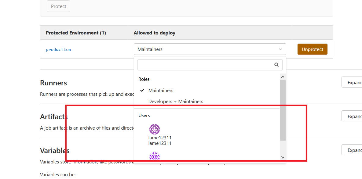 - As maintainer go to your project settings > CI/CD > Protected Environment and define a protected env such as