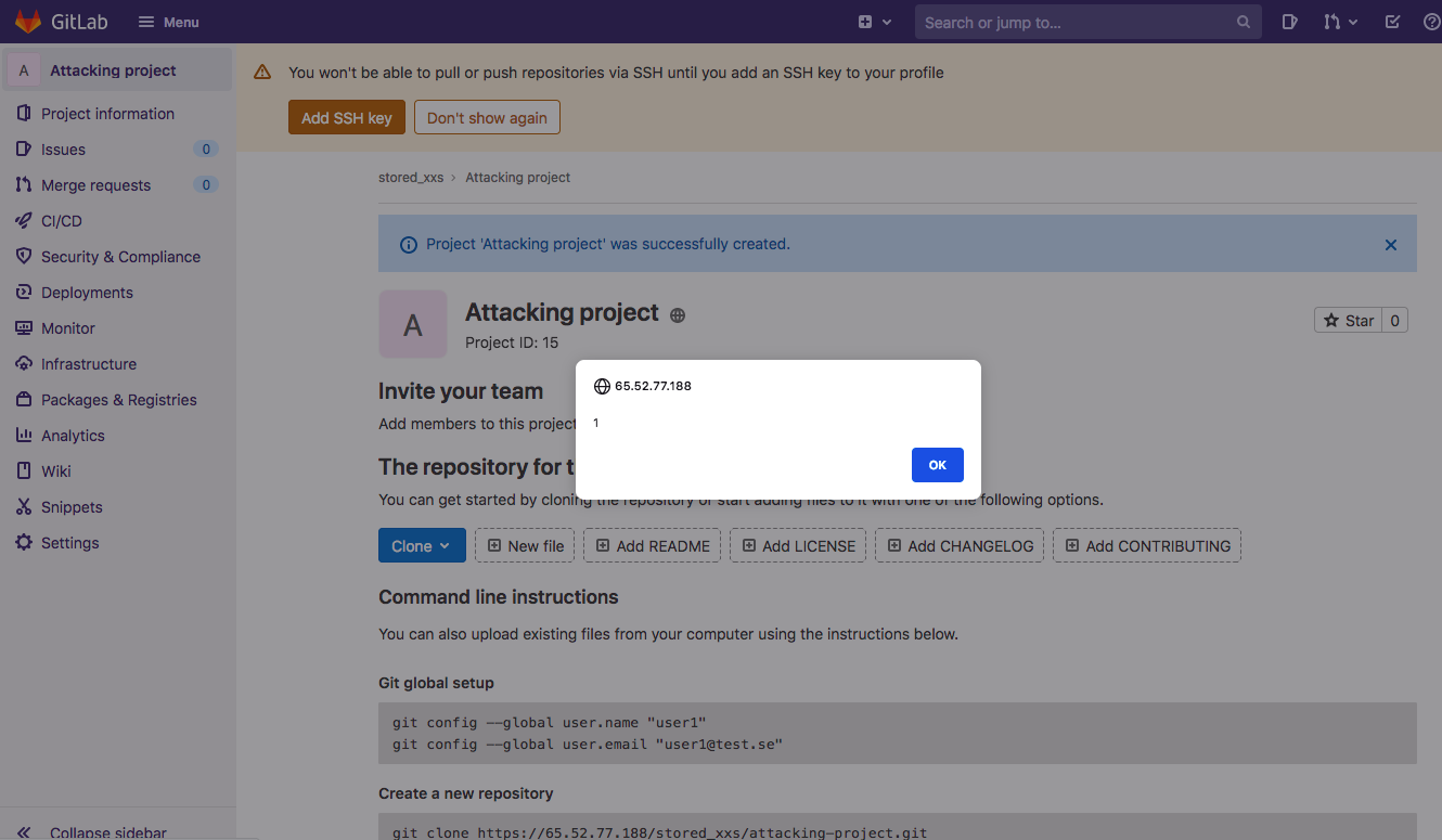 attacking_projectand click "Create project" - Now the project will load and the alert should pop up.