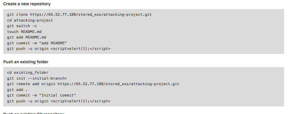 The field "default branch name" under https://gitlab.com/groups/group_name/-/settings/repository accepts arbitrary text (long JavaScript strings as an example). When a project without a initial repository is created in the group the developers are presented with an information page with example terminal commands to execute to set up a repository. This information includes two unzanatized inclusions of the "default branch name", resulting in execution of the JavaScript payload.