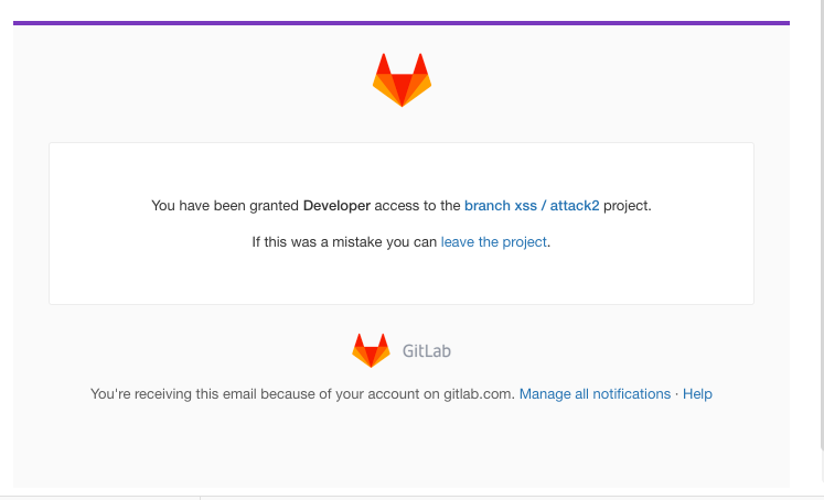 As I mentioned, the victim needs to be at least a Developer on the project (if not a site admin) when accessing the project main page. This is not a problem (rather an asset) for the attacker. All the attacker needs to do is invite targeted victim users as Developers to the project. This will trigger GitLab to send out information to the victim (emails or notifications) that will work as validated phishing links (see image below). The victim just need to click the link in the email and land on the project main page.