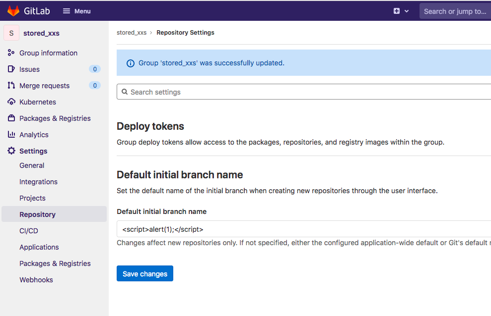 <script>alert(1);</script>as "Default initial branch name" and click "save changes"