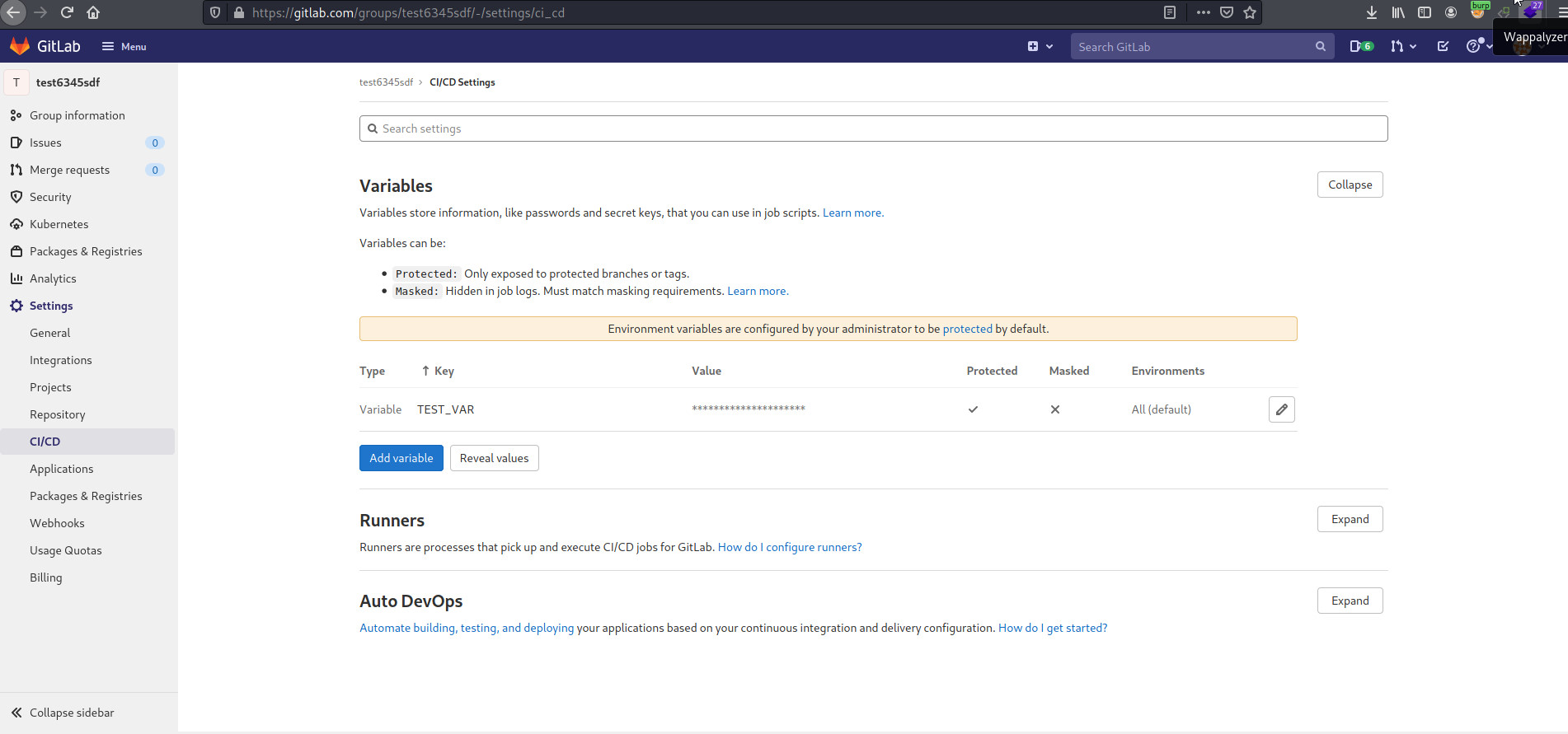 - Go to group settings and add a custom ci/cd variable named "TEST_VAR"