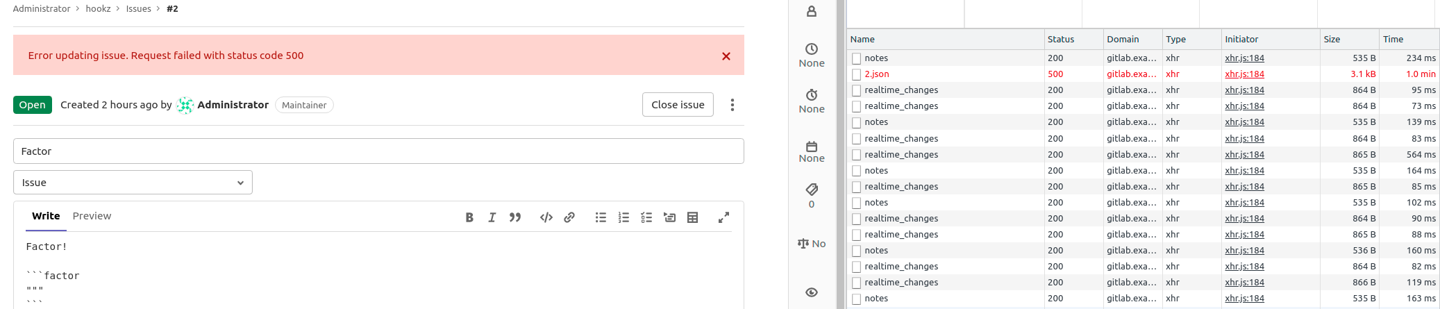 Visiting a wiki page with crafted factor, ceylon or ghc-core fenced code blocks will fail with a 500. If done on the home page, this blocks all access to the Wiki, unless you have a link to a particular wiki page or append /edit to the wiki page and fix it.