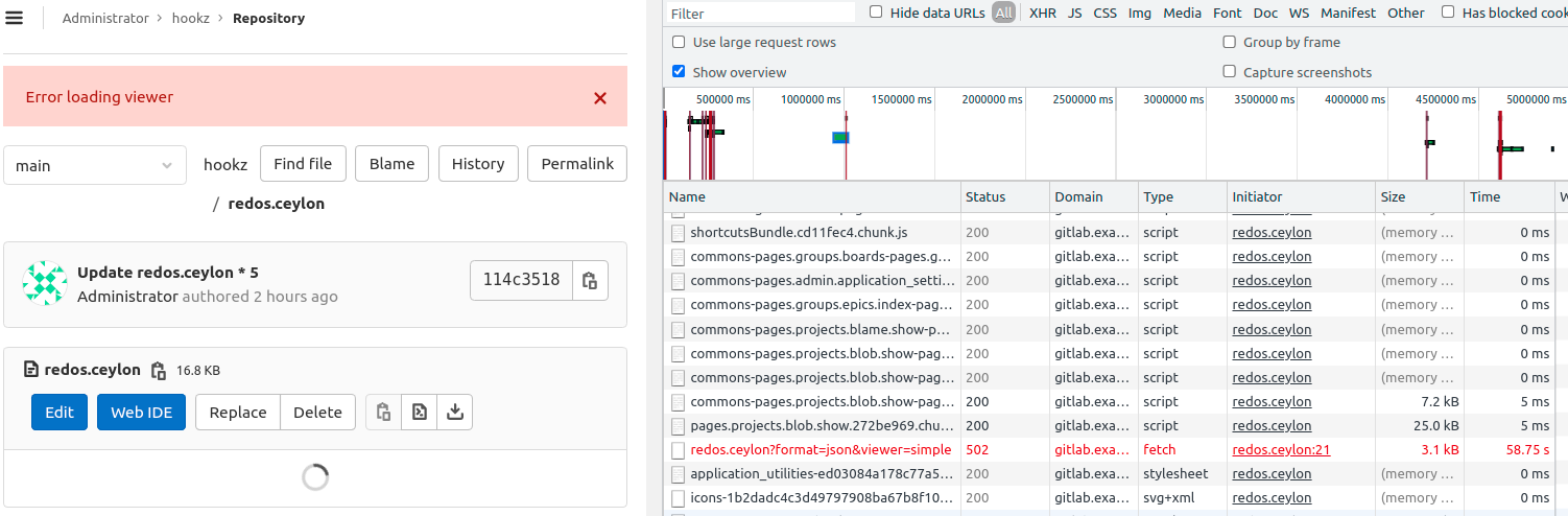 Upload the redos.factor and redos.ceylon payloads to a repository and then view them. Increase the length of the repeating part to increase the time taken to process. If it takes >60 seconds, there will be a 502 error.