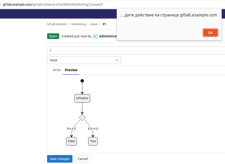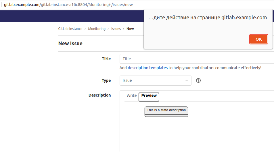 docker run --detach --hostname gitlab.example.com --publish 443:443 --publish 80:80 --publish 22:22 --name gitlab gitlab/gitlab-ce:latest(GitLab Enterprise Edition 14.4.1-ee) - Insert into any field that supports markdown with using Mermaid the following payload (stateDiagram-v2):