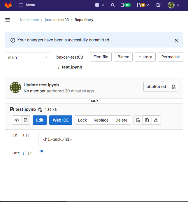 Now to the attack. If an attacker creates a Jupyter Notebook there exists the possibility to add HTML in the output fields. This HTML will be sanitized by DOMPurify, but this will not stop the attack.