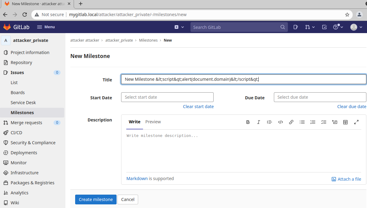 This Stored XSS can be placed in the various Markdown field, and by using cross-project reference and Multi-word milestone in combination,