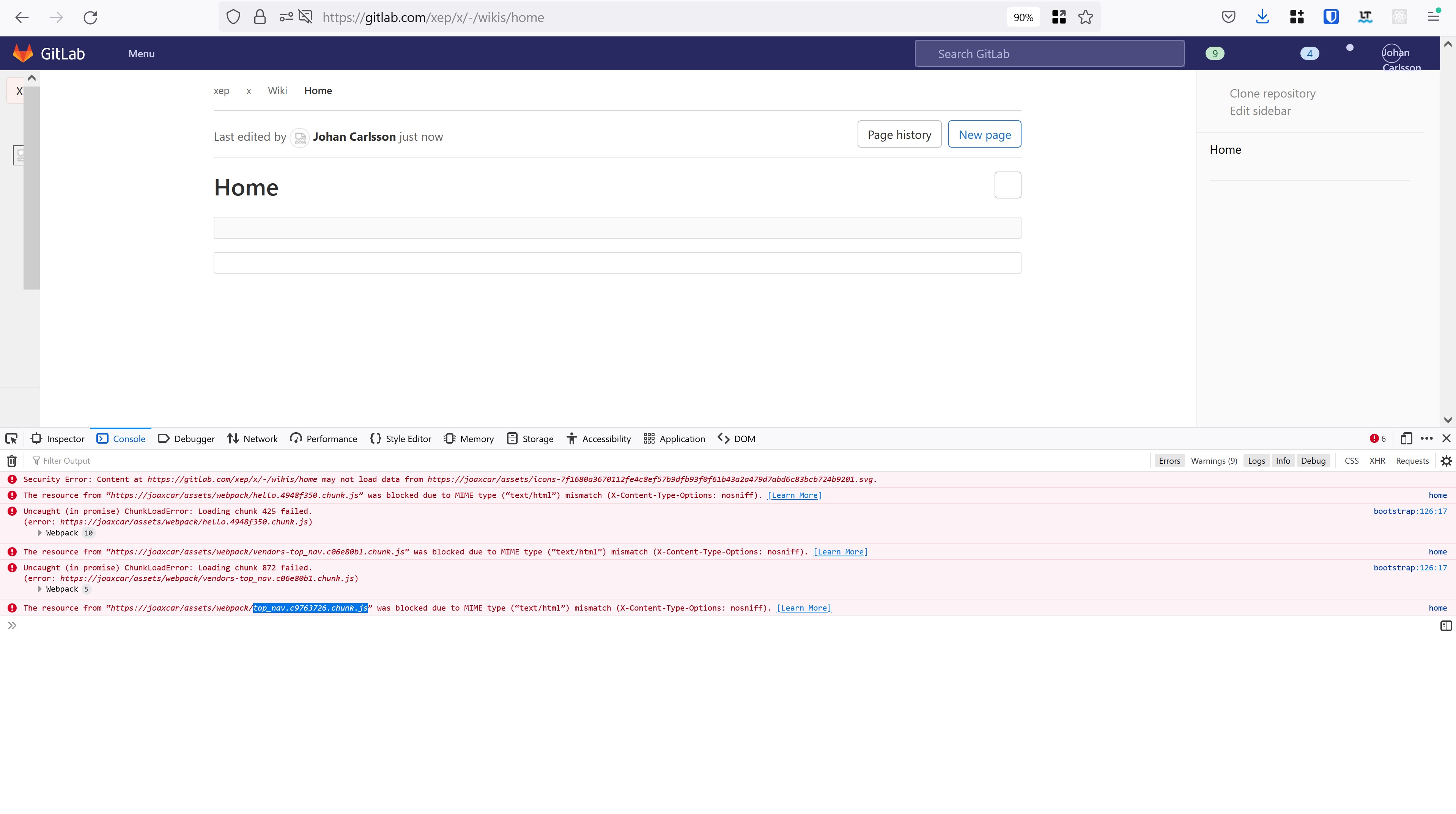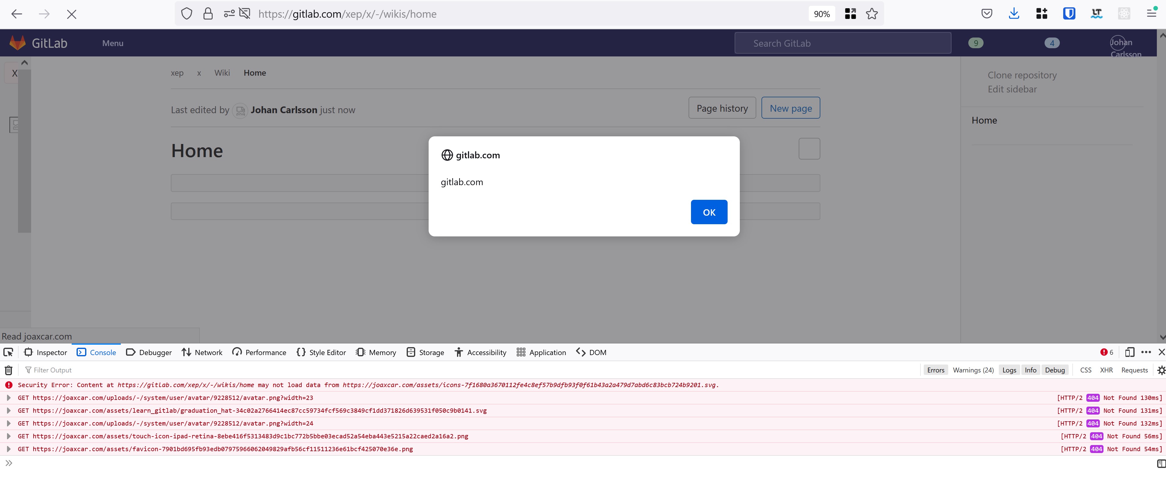 All relative links in the page will try to load their data from my site "joaxar.com". If we then open DevTools and reload the page, we will see the name of all files that failed to load. In the case of an issue page, we have this script