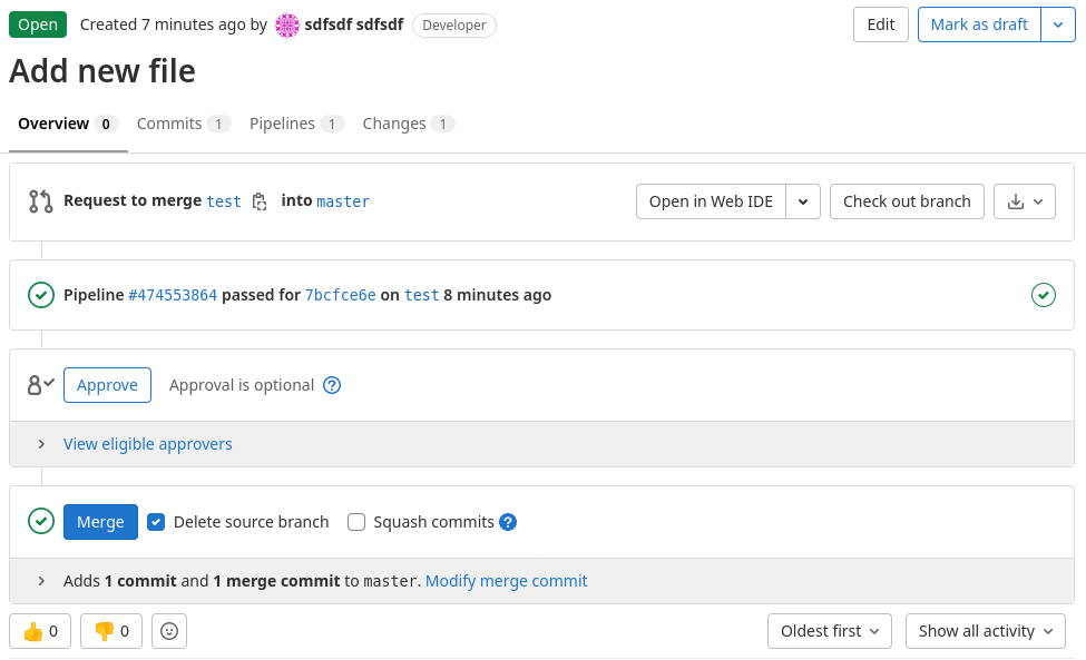 - Add the following .gitlab-ci.yml file to the newly created branch and create a merge request