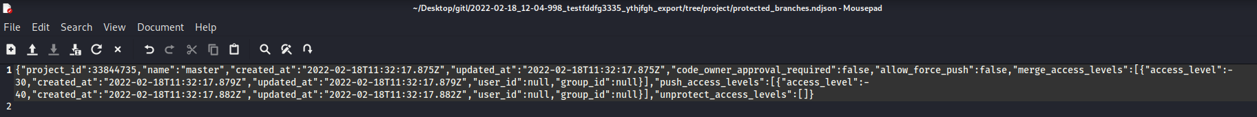 - With account B, modify the project import file, go to tree/project/protected_branches.ndjson