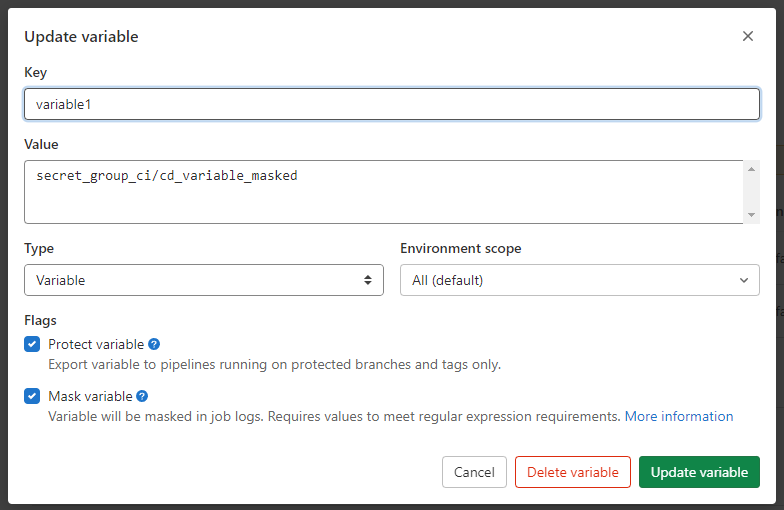 - Create a group with account A and masked CI/CD group variables (Group settings -> CI/CD -> Variables)