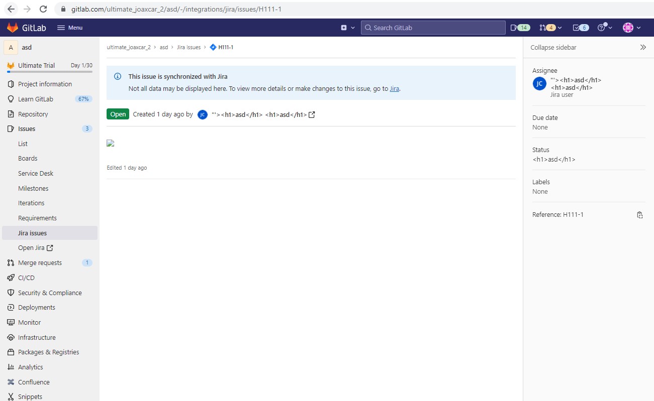 - Now visit the https://gitlab.com/attack_group/attack_proj/-/integrations/jira/issues list with the OAuth user and click the task with the payload
