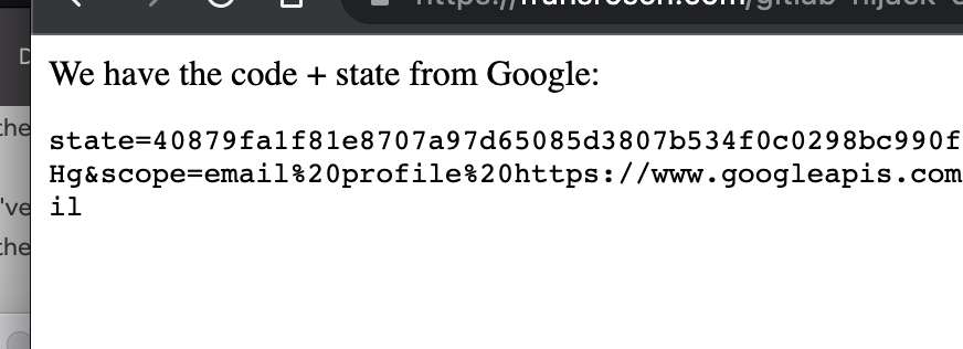 state-value that the attacker set. Also, theresponse_typeis modified fromcodetocode,id_token. This is the second important part why we can steal the code. Gitlab is wiping any?code=-parameters from the URL if there's an error, but Gitlab will not wipe any fragment parts. And when Google gets bothcodeandid_tokenas theresponse_type, everything will be sent as a fragment, ie:url#state=x&code=y&id_token=zinstead of in a query string. The fragment data is still left when in the URL when there's an error, and is also passed down by postMessage togitlab-api.arkoselabs.comwithlocation.href. - Victim clicks the link from the attacker page, will go through "sign-in with Google" for Gitlab, but with a