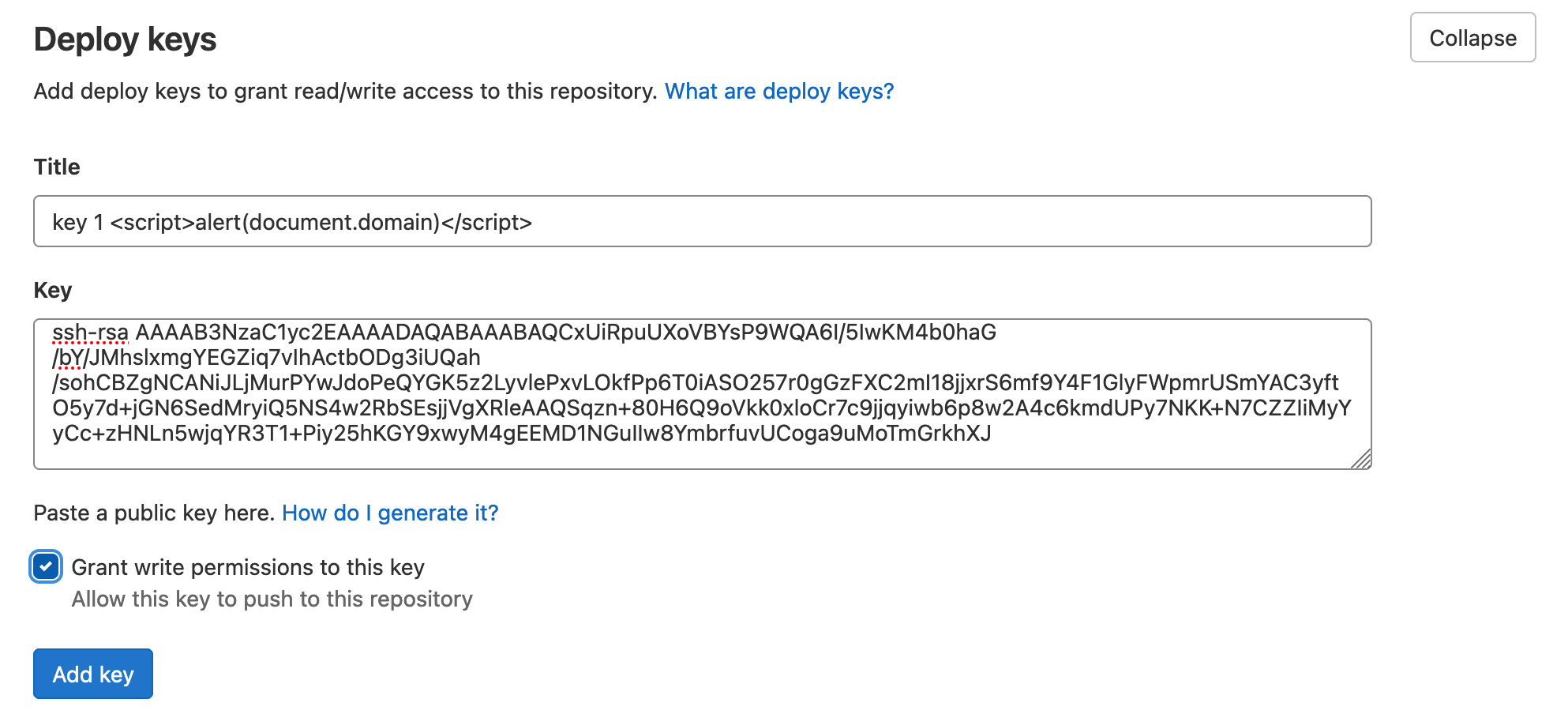It is used to render a deployment key in a dropdown item. Because the deployment title is controlled by users, it can be any html content, such as, <script>alert(document.domain)</script>. Furthermore, the html content will be rendered using jQuery, so the <script> tag will be executed despise of CSP with script-src having 'strict-dynamic' value: