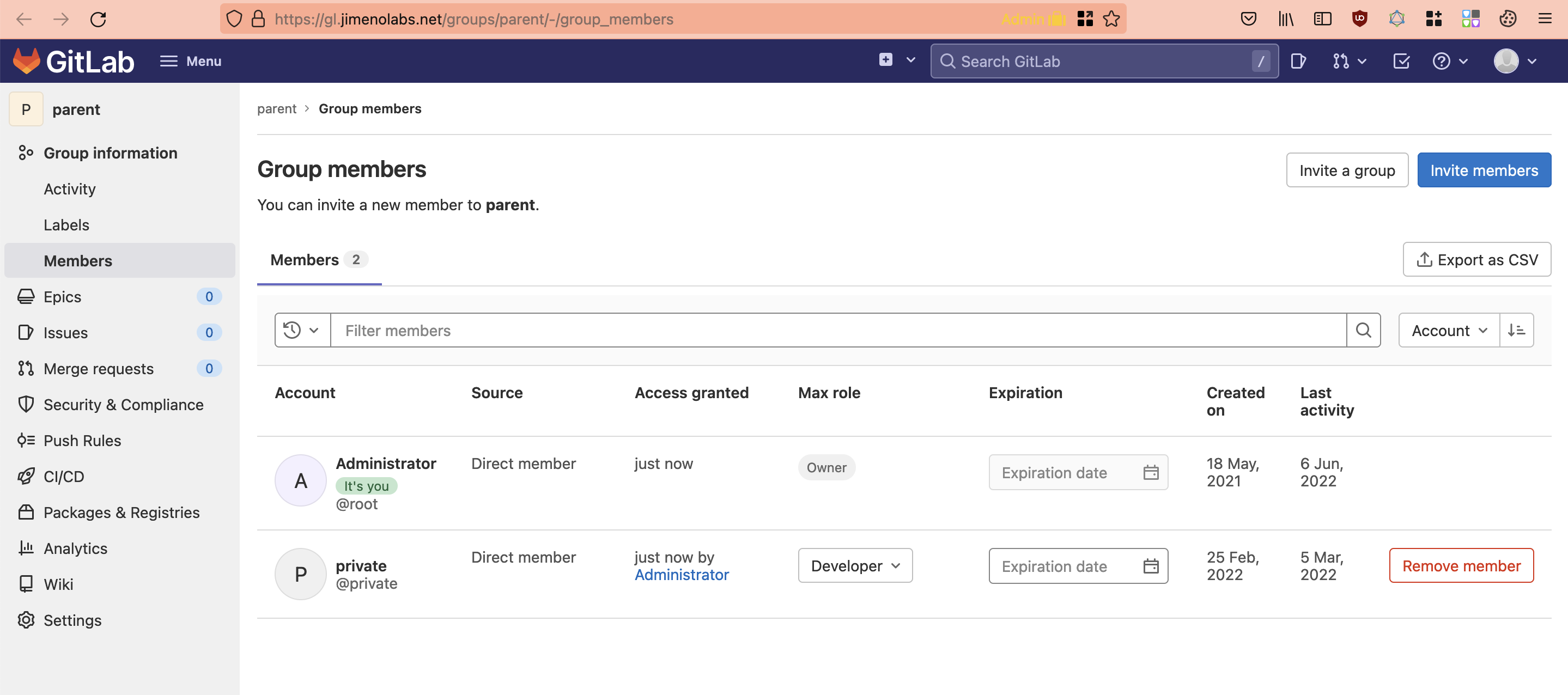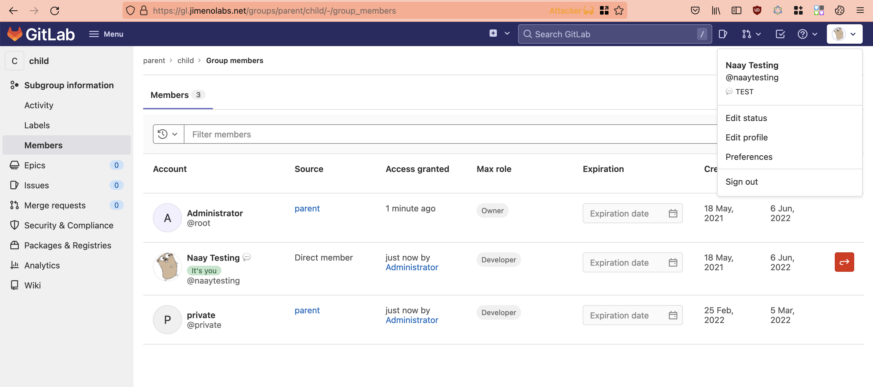 naaytesting) browse tohttps://gl.jimenolabs.net/groups/[PARENT]/[child]/-/group_membersreplacing the placeholders with yours. -