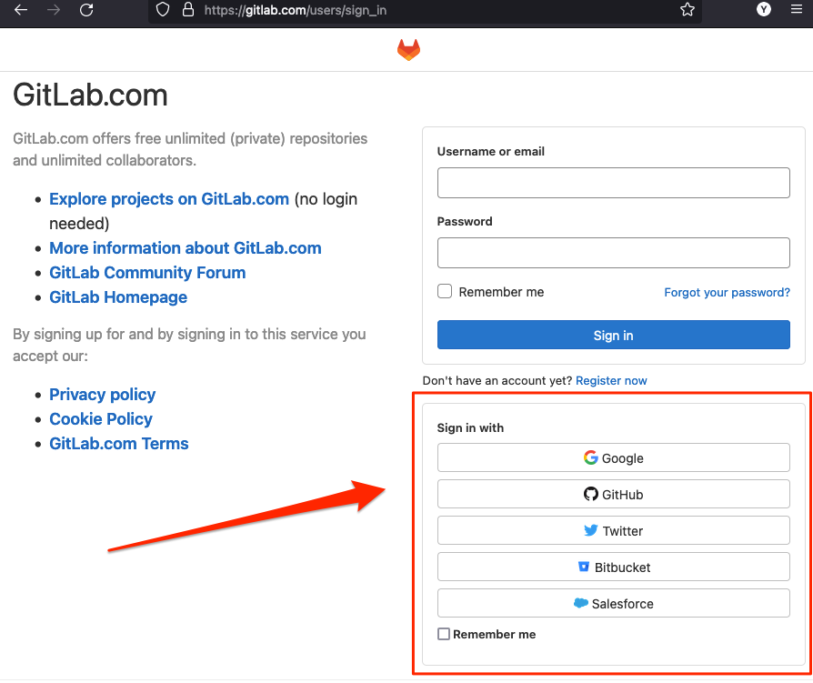 These steps will be done on Gitlab.com. You need to have a victim account to take over. This account is registered on Gitlab.com by logging in via a third provider, such as, a Google, Github, Twitter, Bitbucket, or Saleforce.