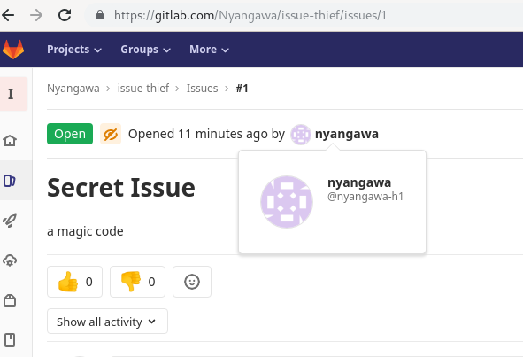 - Check the issues page of the imported project. You will see an private issue created by https://gitlab.com/nyangawa-h1 instead of the current user.