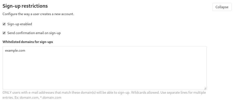 Send confirmation email on sign-upcheckbox and set theWhitelisted domains for sign-upstext area toexample.com - Click to Save Changes button