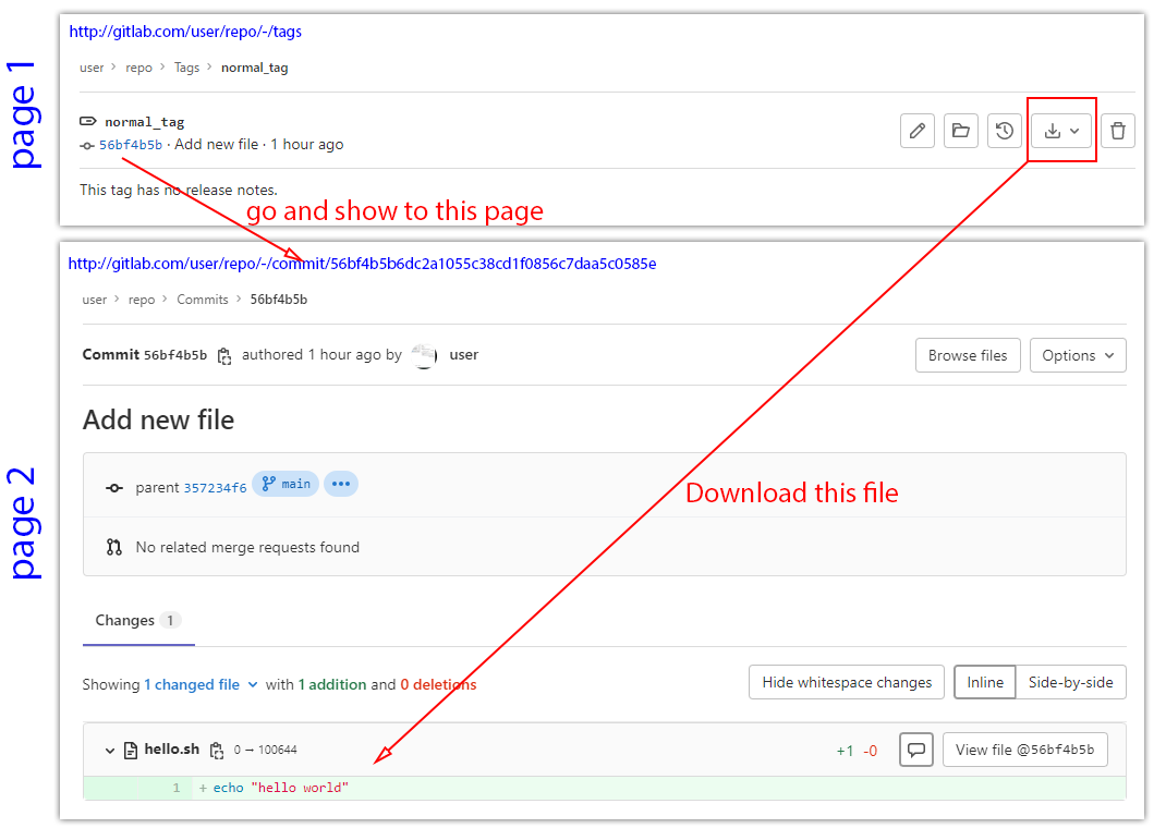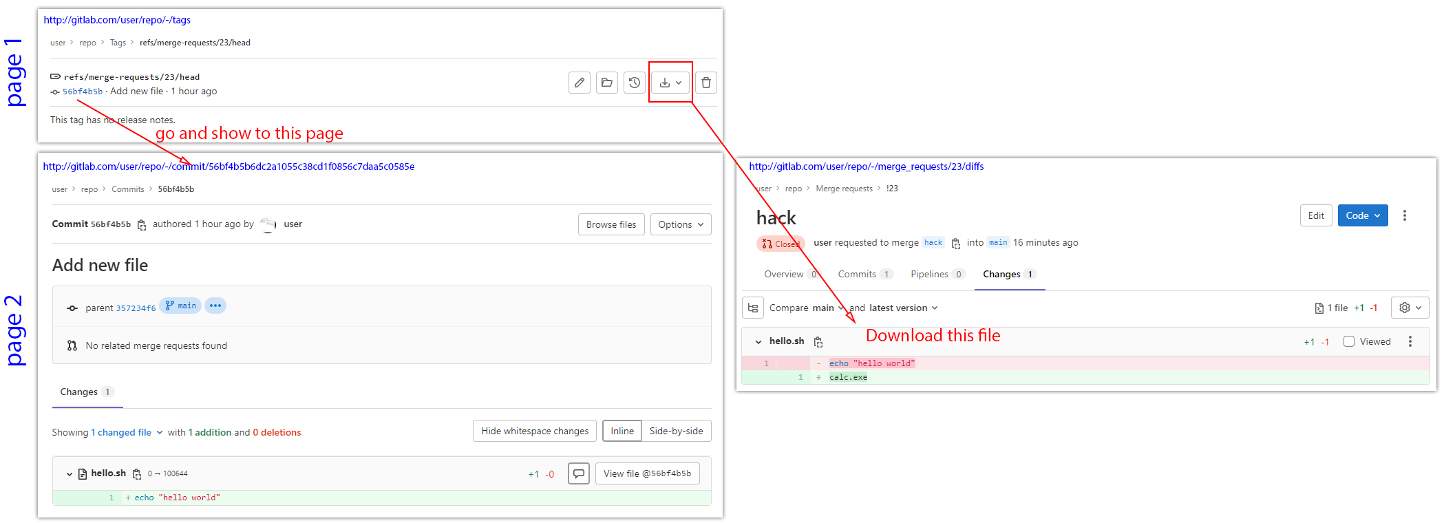 Now, when an attacker creates a tag named refs/merge-requests/<ID-MERGE-REQUEST>/head, where ID-MERGE-REQUEST is the id of the merge request that the attacker created with any malicious changes, when The moment the victim decides to download the source code files from this tag, from the Gitlab web interface they would see that the tag points to a legitimate and harmless commit; however, when downloading the files from this tag, it would get the changes made from the merge request created by the attacker.
