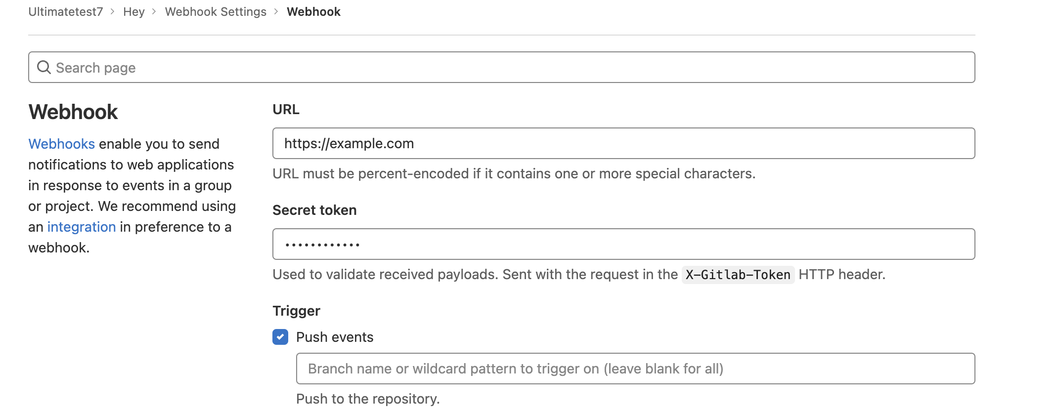 - Go to https://gitlab.com/GROUP/PROJECT/-/hooks and configure a webhook. Make sure to add a secret
