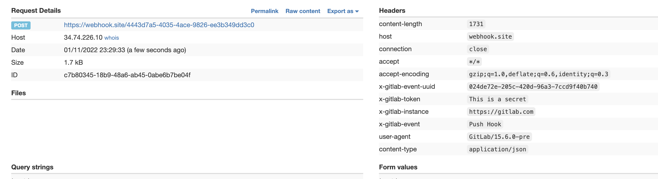 - Check your server to see that the request is sent to the new URL and containing the secret token