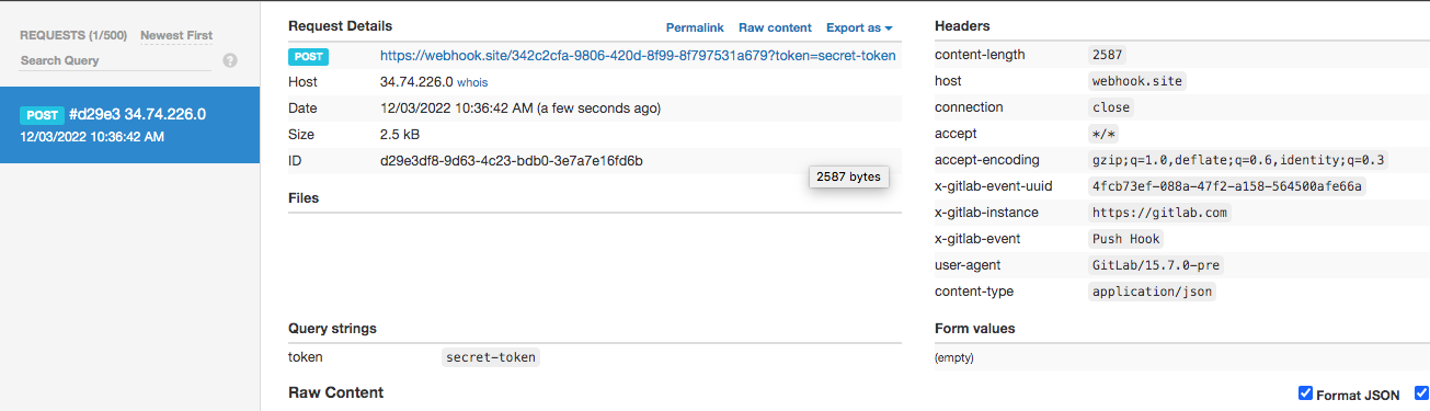 - Check your server to see that the request is sent to the new URL and containing the secret token
