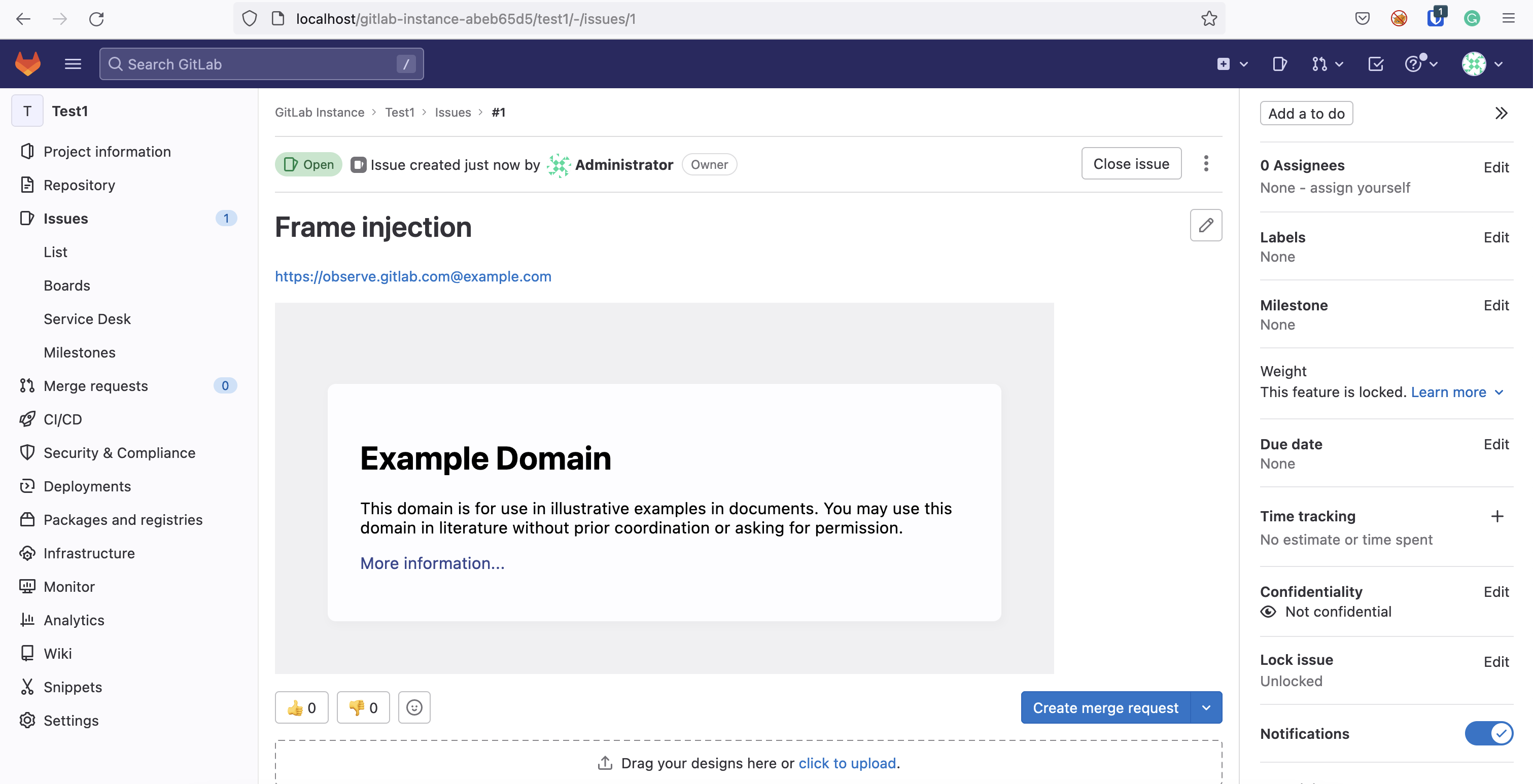 Browsers have different mitigations when it comes to securing content in iframes. Chrome will for example not allow frames of links containing basic auth, meaning username:password. And thus Chrome will not allow the https://observe.gitlab.com@example.com attack. All browsers allow framing of https://observe.gitlab.com.example.com. But this requires the attacker to issue a valid certificate for the domain as normal wildcard certificates will not work on multi-level subdomains. This is not an issue and is easy to do, but for the sake of simplicity, I required to use Firefox in my PoC. I will get back as soon as I have registered a valid cert for the Chrome attack.