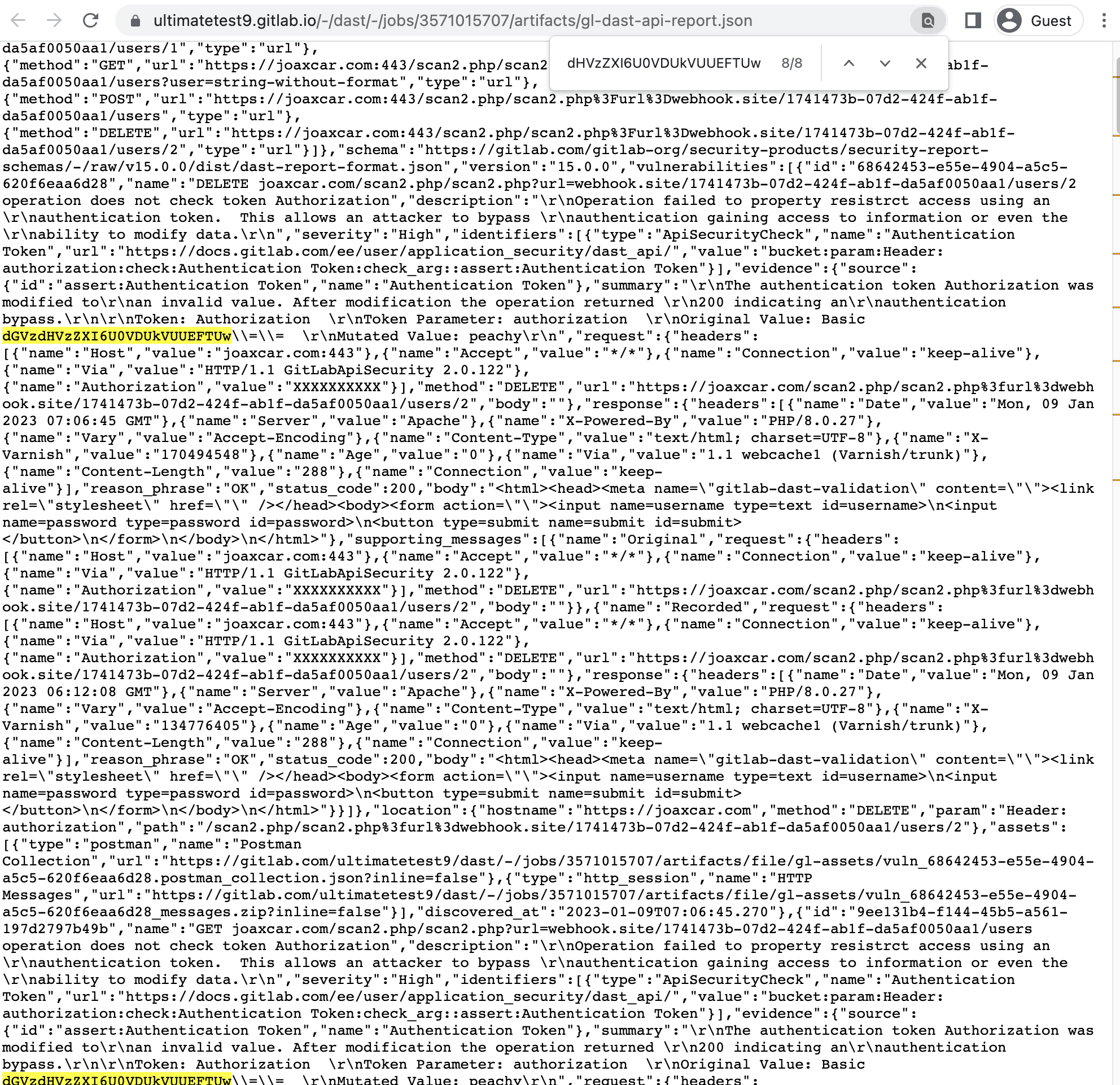- Open the gl-dast-api-report.json file and see that the logs contain the auth header.
