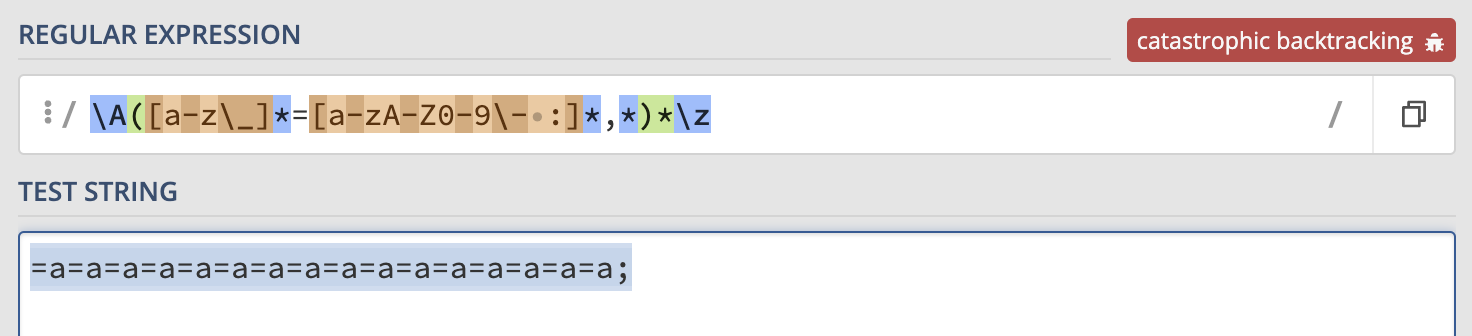 You can test the regexp /\A([a-z\_]*=[a-zA-Z0-9\- :]*,*)*\z/ on https://regex101.com/ and enter the payload =a=a=a=a=a=a=a=a=a=a=a=a=a=a=a=a; The page will warn for catastrophic backtracking